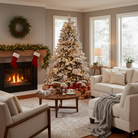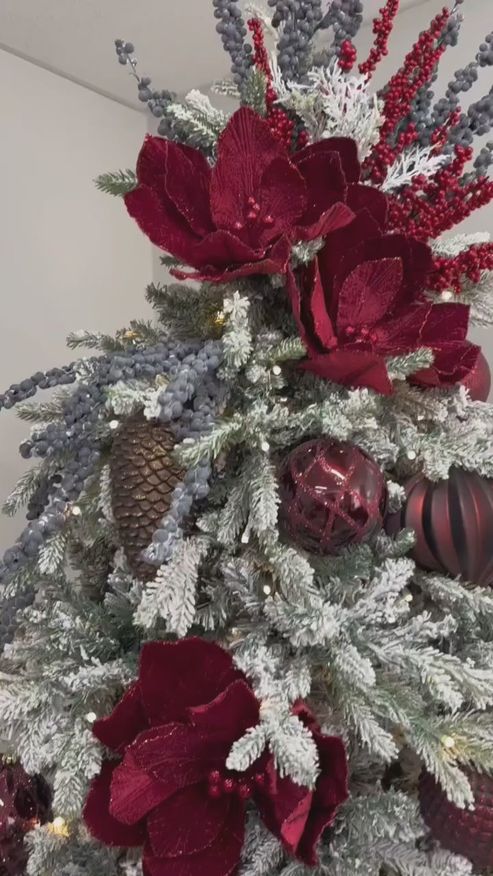 I rami sono pieni di foglie fino all'estremità e perfettamente innevati: il bianco è elegantemente distribuito su tutta la chioma grazie al metodo della "floccatura" che trasmette la magia di una silenziosa nevicata notturna senza l'inconveniente della caduta indesiderata di polveri sul pavimento.