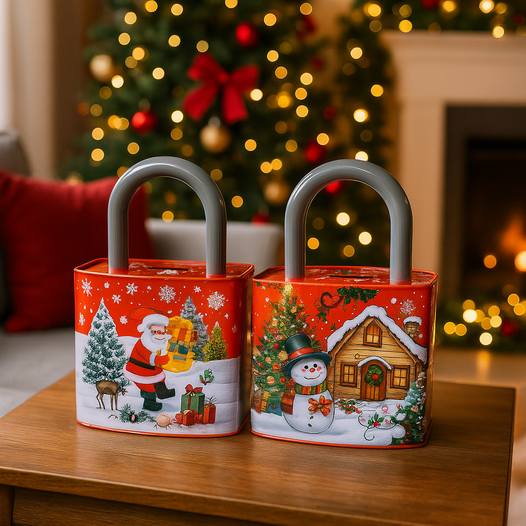 Salvadanaio decorativo lucchetto in latta per decorazioni natalizie