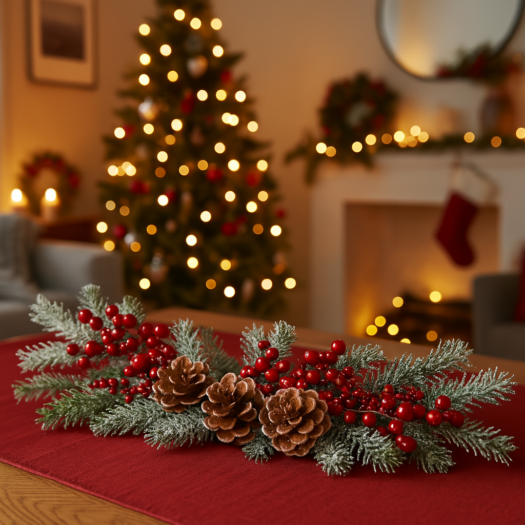 Centro tavola decorativa color verde con bacche e fiori per decorazioni floreali