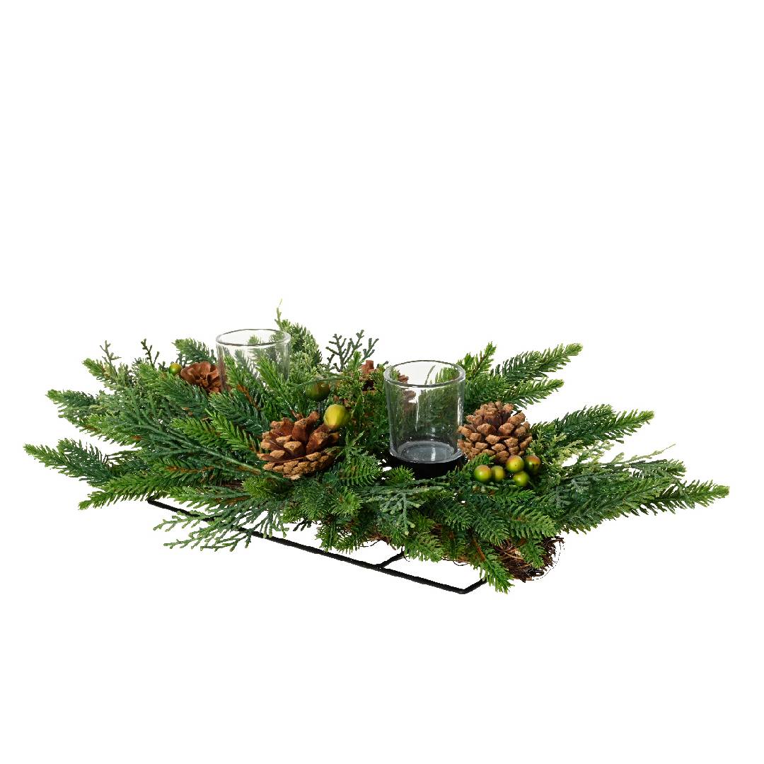 Centro tavola porta candele color verde con pigne per decorazioni natalizie, da 50 cm