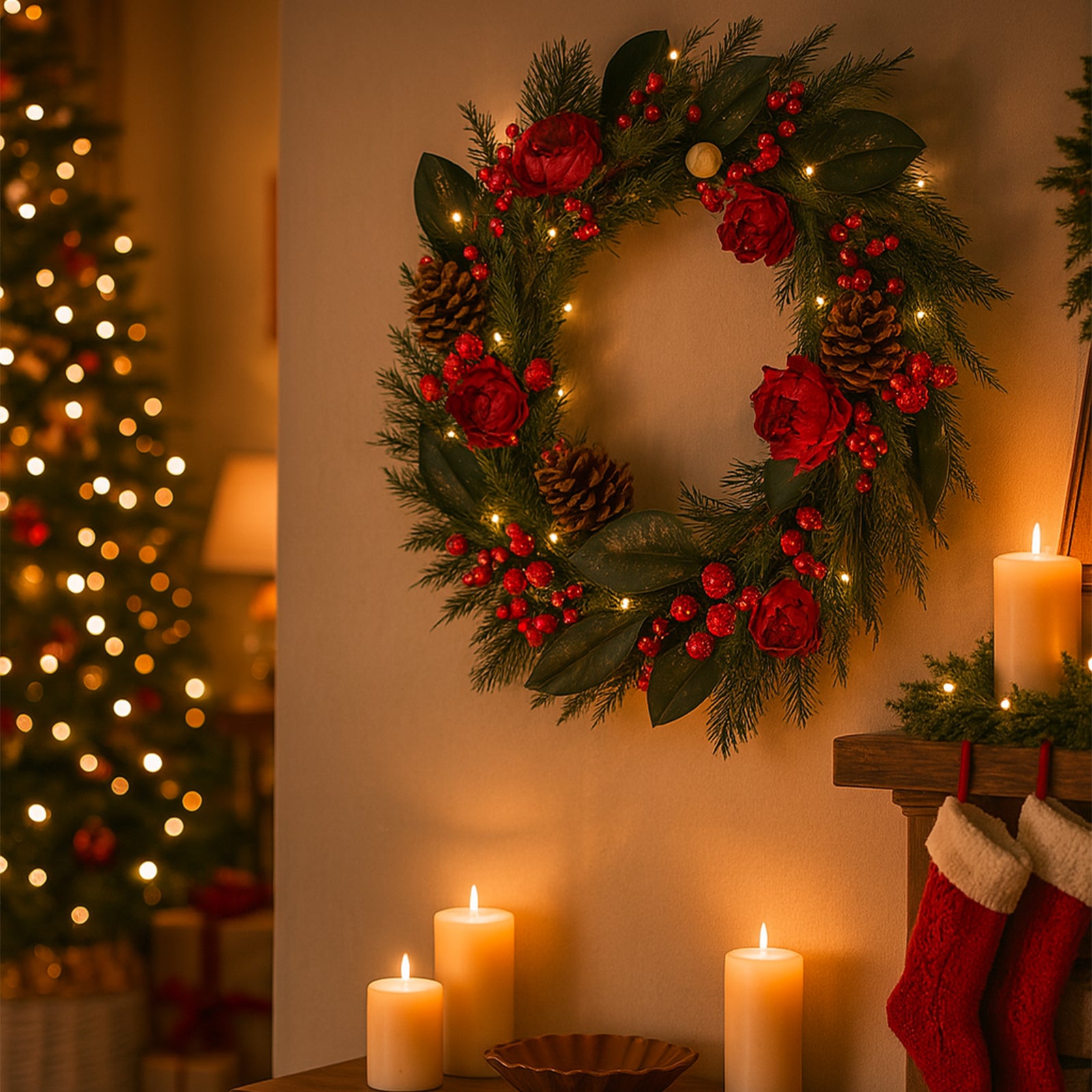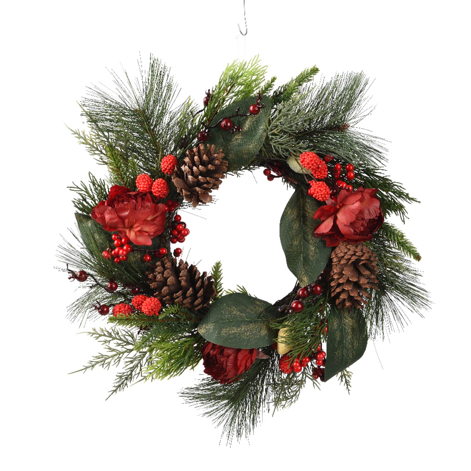 Ghirlanda natalizia con bacche e pigne, decorazione da interno ed esterno per dietro porta da 30 cm
