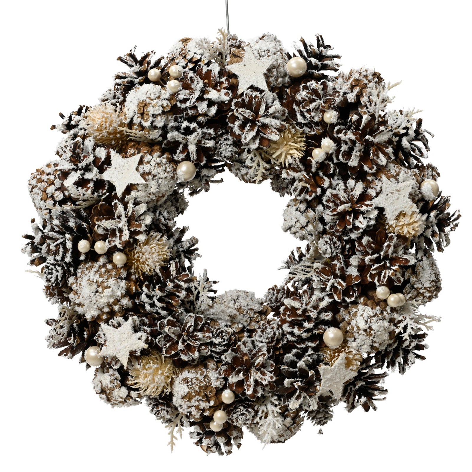 Ghirlanda tonda natalizia con pigne innevate dietro porta 34 cm