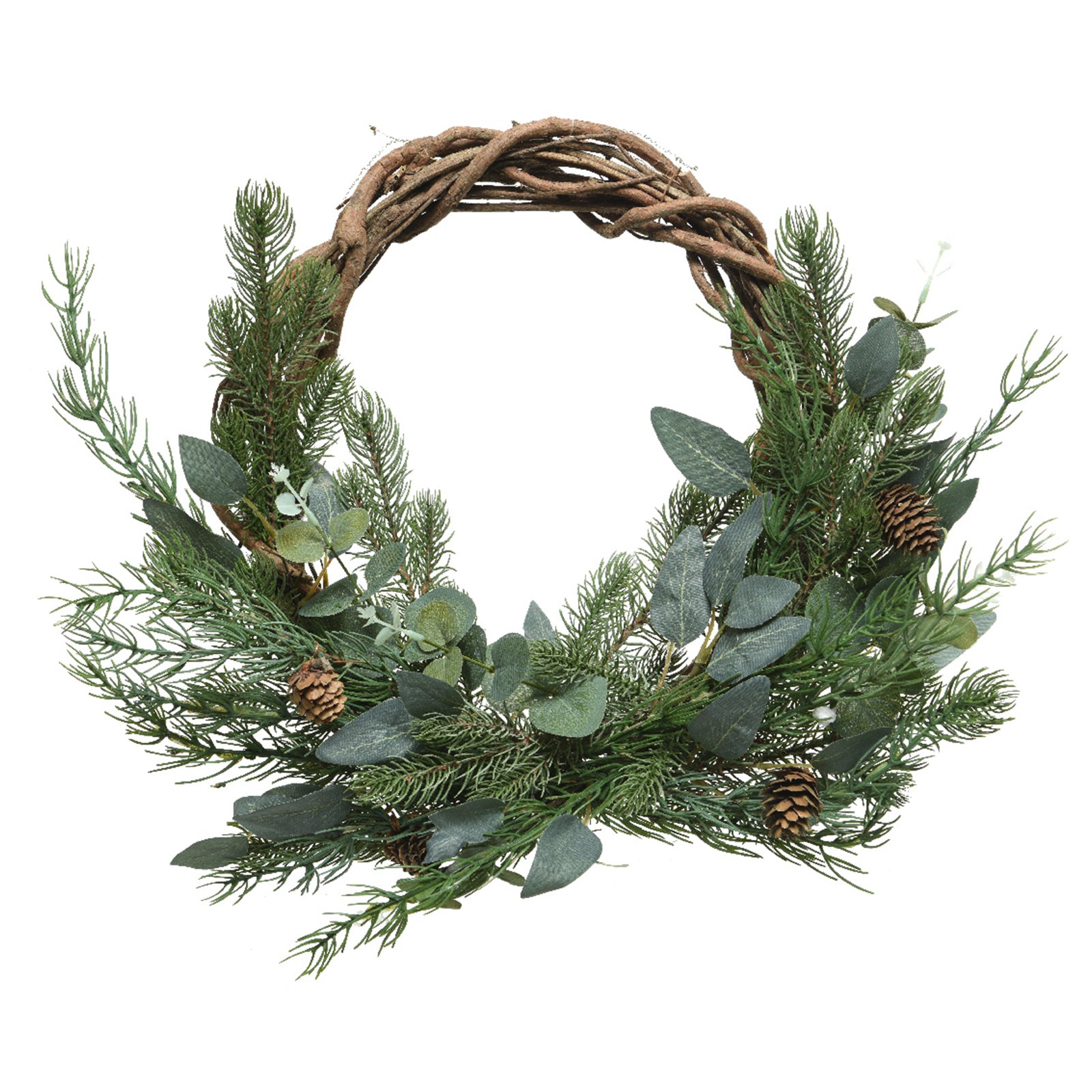 Ghirlanda tonda natalizia con pigne e eucalipto dietro porta 40 cm
