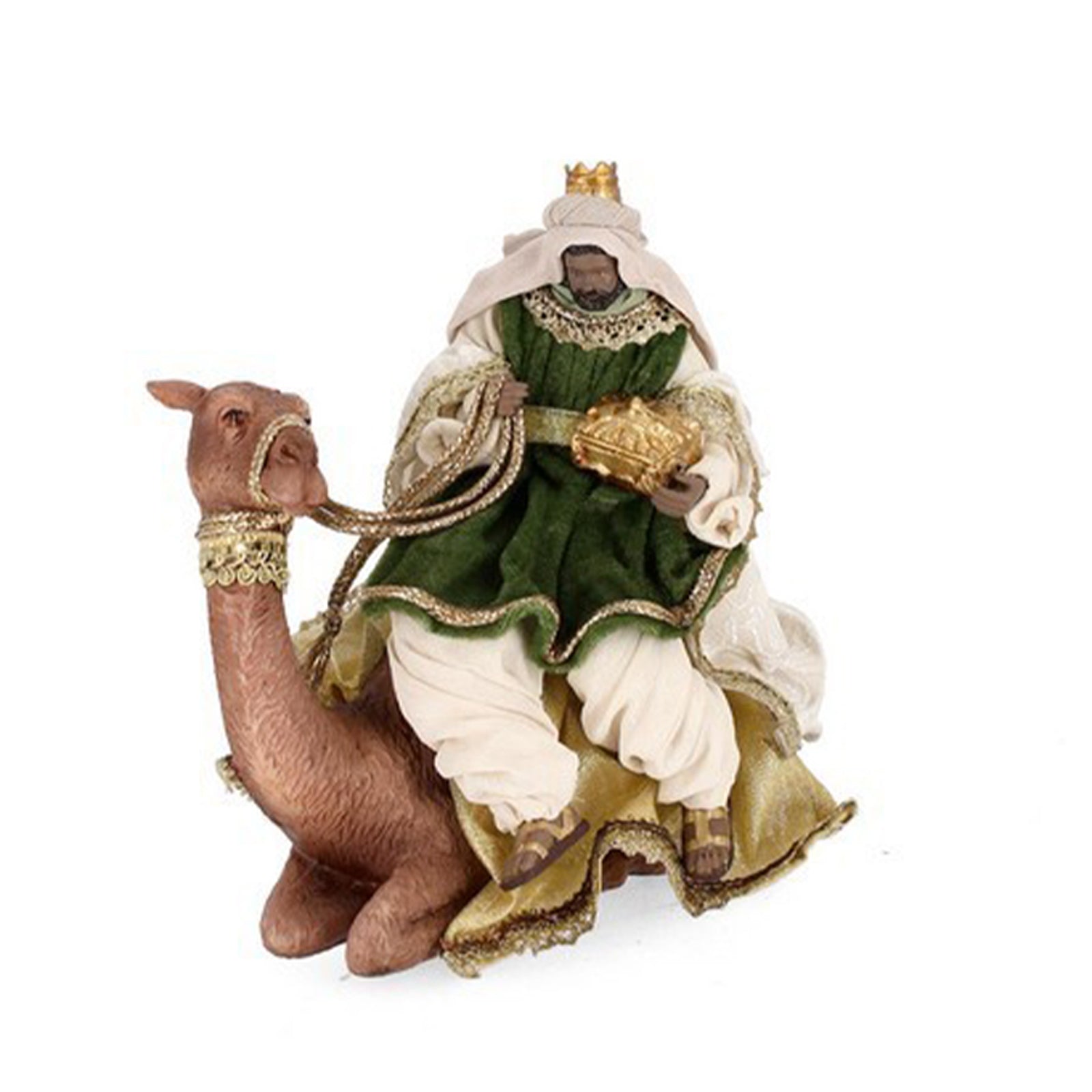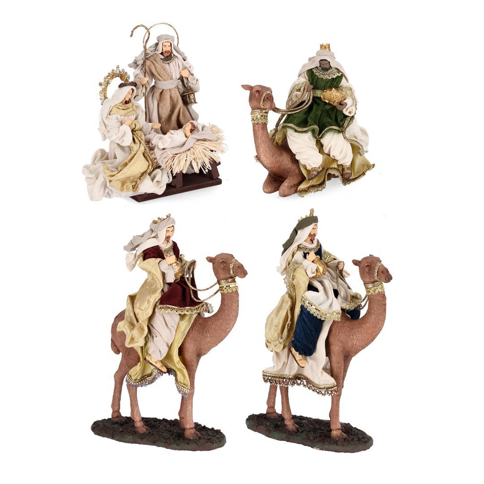 Natività con 3 dromedari con re magi con vestiti in tessuto color oro statue per presepe