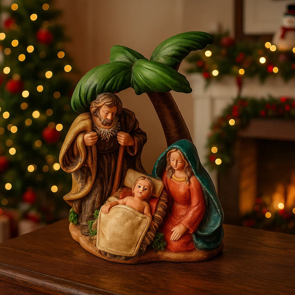 Natività monoblocco con 3 figure per presepe in ceramica con palma moderna per presepe h 12 cm