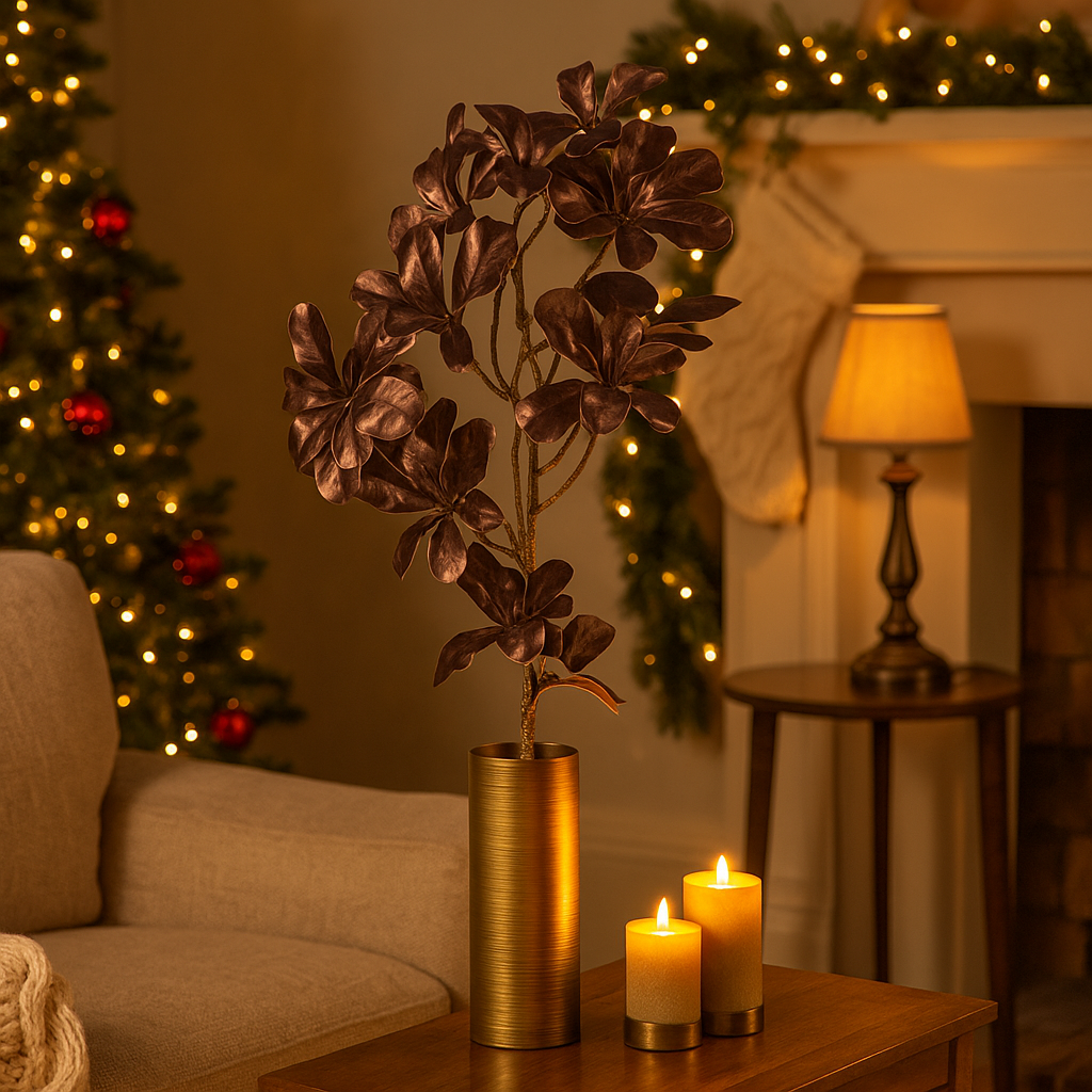 Ramo di camelie decorative con stelo dorato in poliestere per decorazioni natalizie
