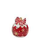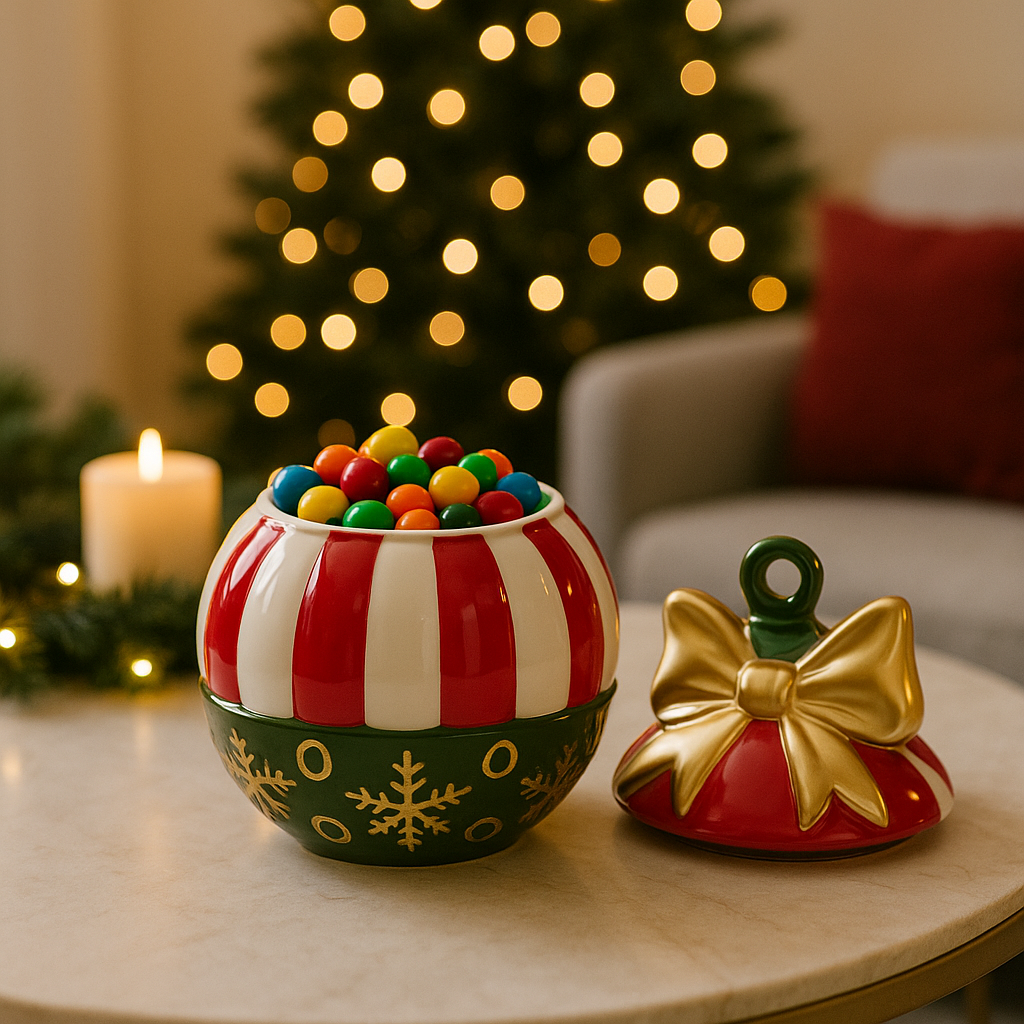 Questo contenitore natalizio ha la forma di una grande pallina rossa, rifinita da un nastro rosso‑bianco che avvolge la parte superiore come se fosse un fiocco‑decorazione.