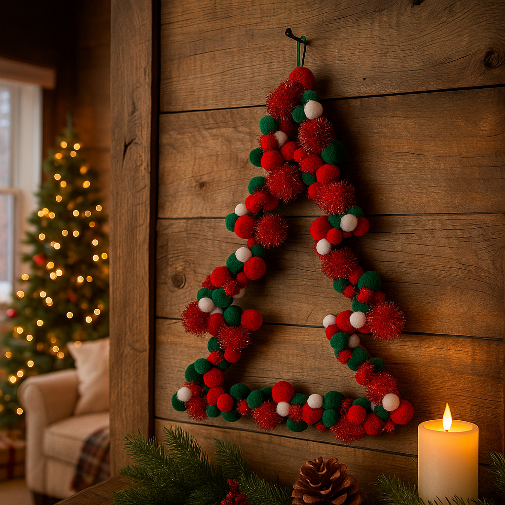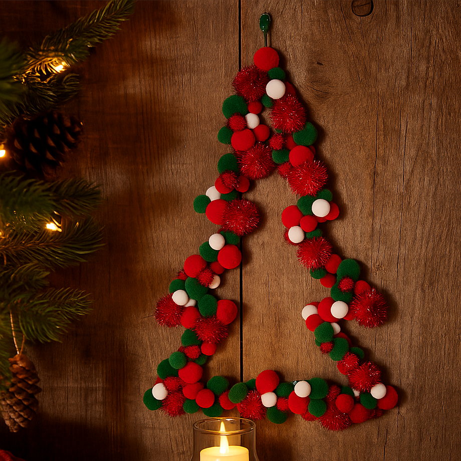 Questa decorazione pensata a forma di piccolo pino porta con sé tutta la vivacità dei pompon verdi e rossi, richiamando i colori più iconici del Natale con un tocco artigianale e giocoso. Perfetta da appendere all’albero, a una ghirlanda, a una finestra o come dettaglio su porte e corrimano, aggiunge movimento, texture e allegria in pochi secondi, trasformando ogni ambiente in un angolo caldo e accogliente.
