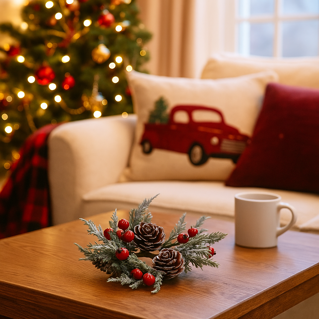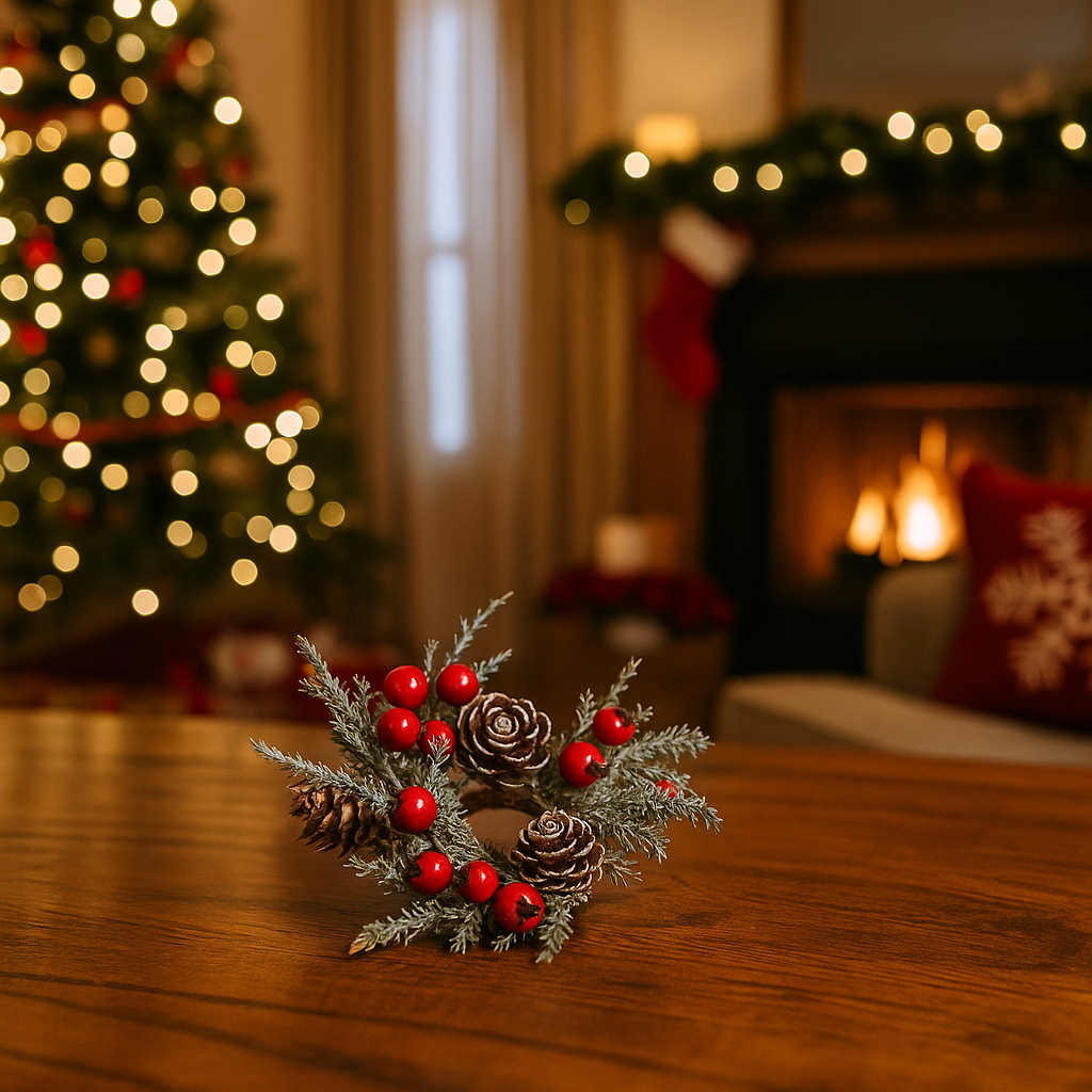 Realizzata con rametti di pino artificiale, bacche rosse e piccoli dettagli marroni, è perfetta per abbracciare una candela e creare un centrotavola che sprigiona tutto il calore e la magia del Natale.