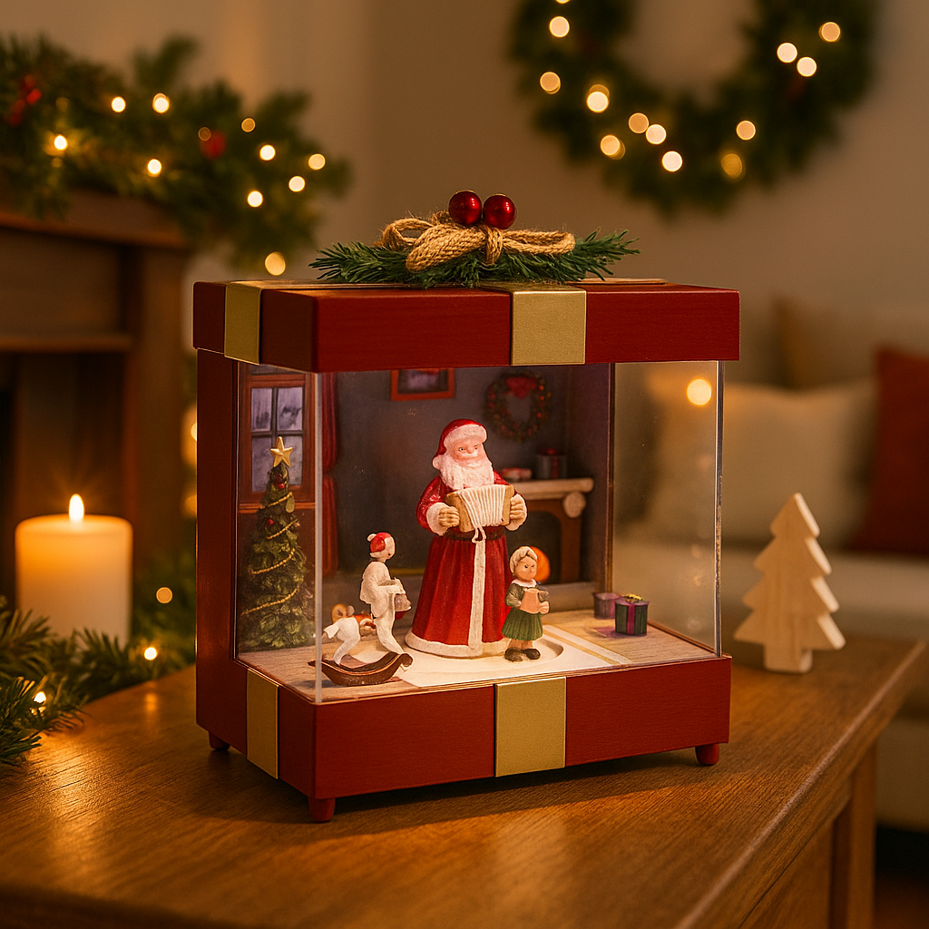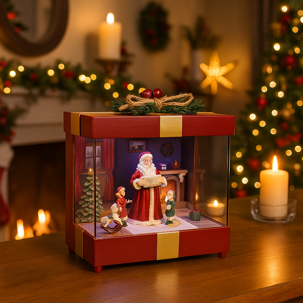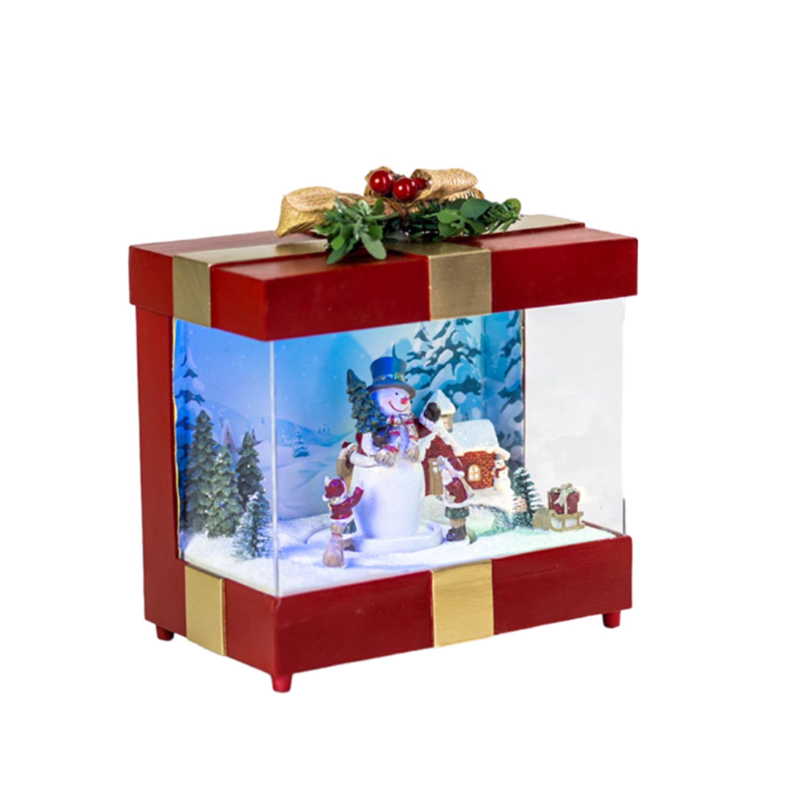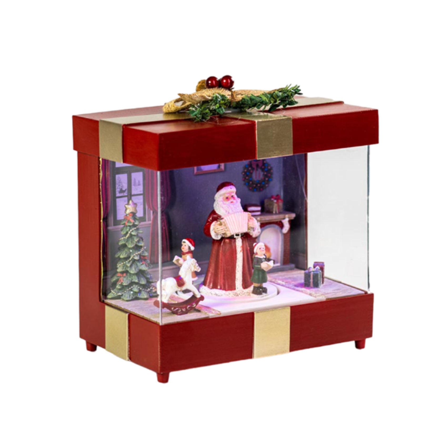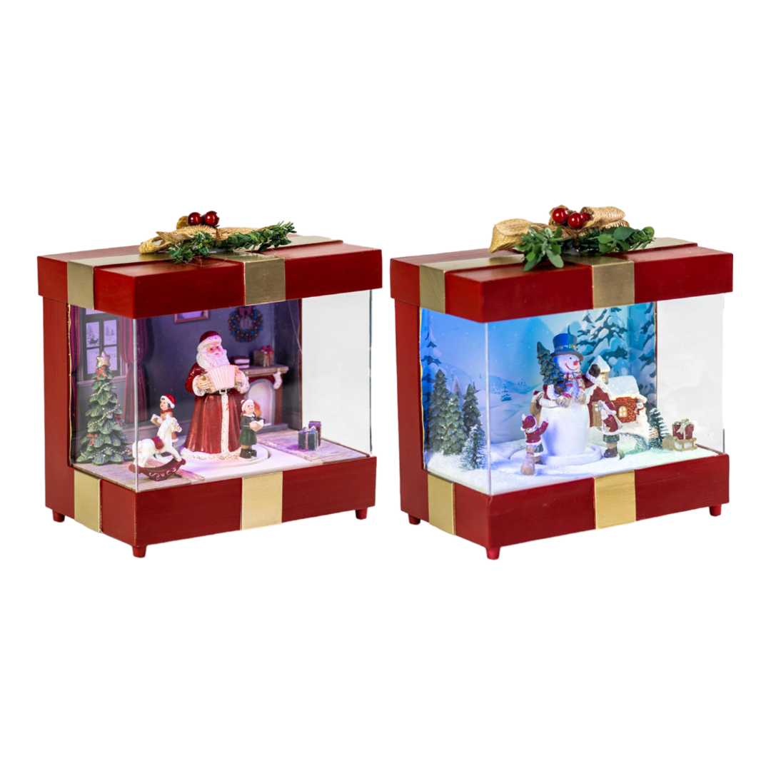 Regala magia e atmosfera alle tue feste con la scena animata pacco regalo con LED e musica, un complemento perfetto per arricchire il tuo villaggio di Natale o decorare la casa con stile.