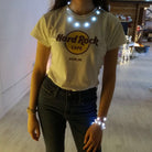 La collana ha 10 led bianco freddo a forma di goccia, posti a 5 centimetri l'uno dall'altro. Può essere indossata in tutta sicurezza perché i led non emettono calore, quindi non recano danni né a persone né a tessuti.