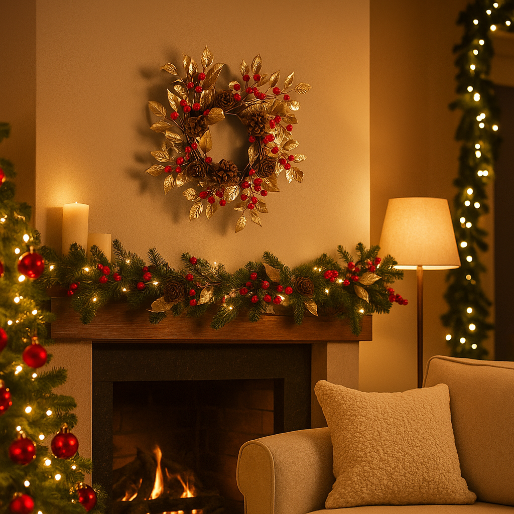 Decorato con bacche, sfere dorate e dettagli luminosi, per un effetto elegante e festivo.