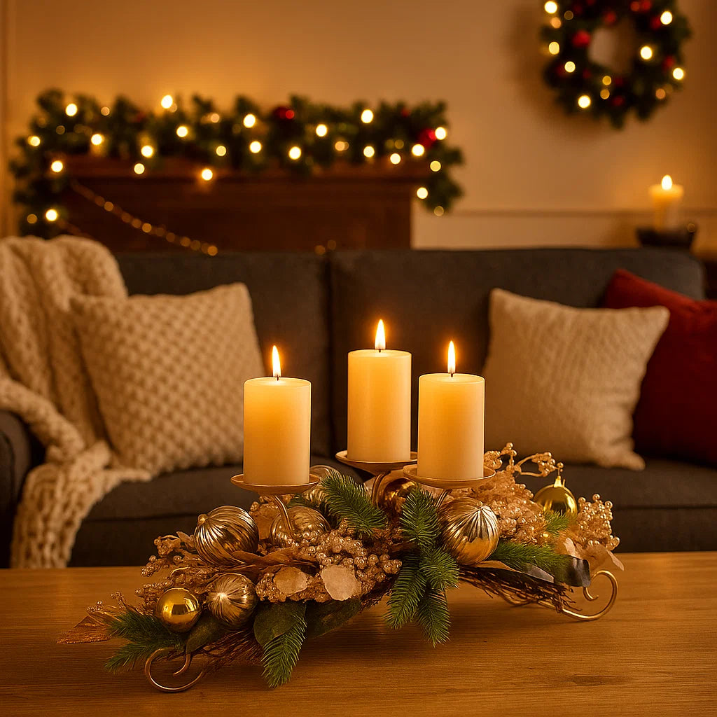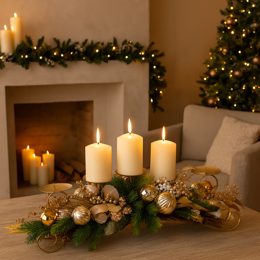 Le sfere decorative aggiungono un tocco brillante e moderno, mentre le candele, una volta accese, diffondono una luce calda e suggestiva, capace di trasformare l’atmosfera.