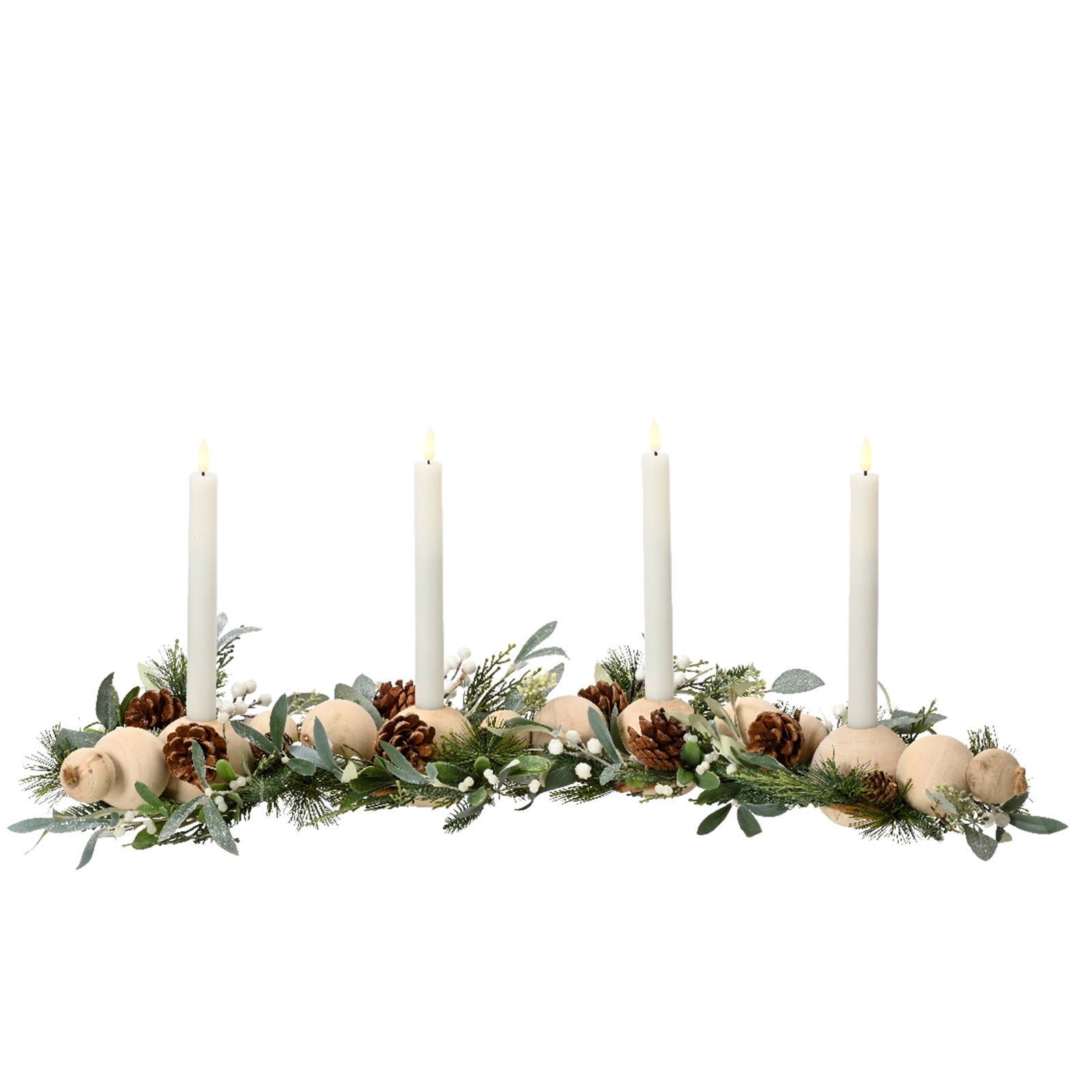 Porta la magia del Natale nella tua casa con questo elegante portacandela, progettato per ospitare 4 candele alte. Con una lunghezza di 80 cm, è una decorazione imponente e festiva, arricchita da dettagli natalizi come bacche rosse e pigne naturali.