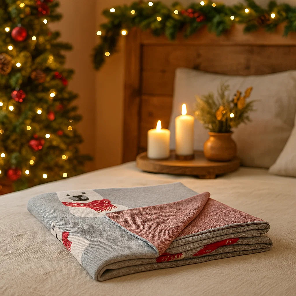 Coperta natalizia "Editha" Orso rosso-bianco in cotone, 130 x 170 cm