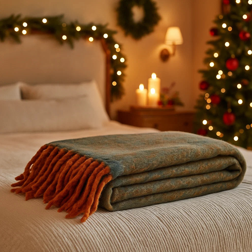 La coperta natalizia “Winnie” blu con frange è pensata per chi desidera portare in casa un tocco di calore elegante e raffinato durante le feste.
