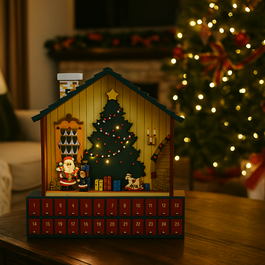 Questa casetta di legno con Babbo Natale integrato è un raffinato calendario dell’Avvento alto 42 cm, progettato per portare un tocco di tradizione e calore nell’arredo natalizio.