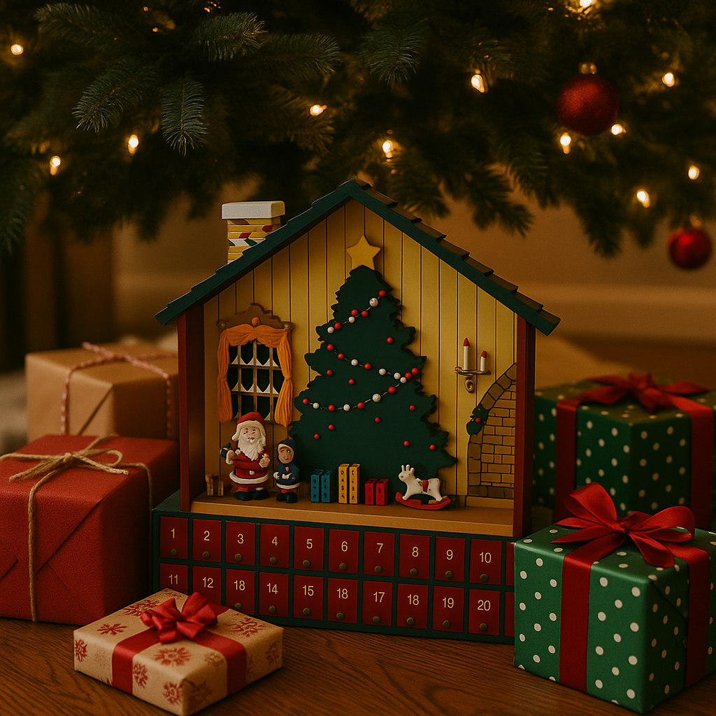 Ciascun piccolo scomparto è decorato con cifre ben visibili, spesso ornate da motivi natalizi come stelle, fiocchi di neve o piccoli pacchetti, e serve per custodire dolcetti, bigliettini o minuscoli regali da scoprire giorno dopo giorno, alimentando l’attesa della vigilia di Natale.