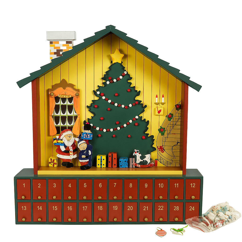 La funzione di calendario dell’Avvento è svolta dai cassettini o finestrelle numerate, solitamente ventiquattro, disposti lungo la facciata della casetta o integrati nelle pareti laterali.