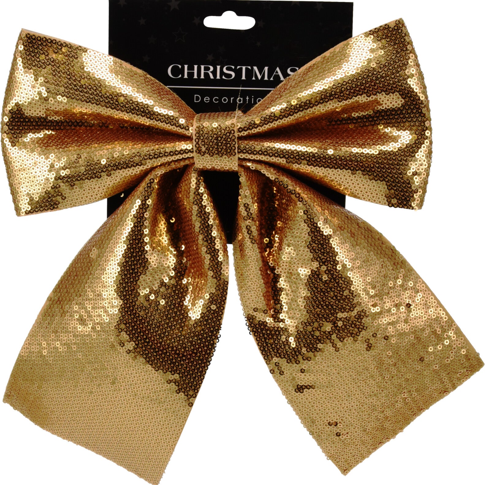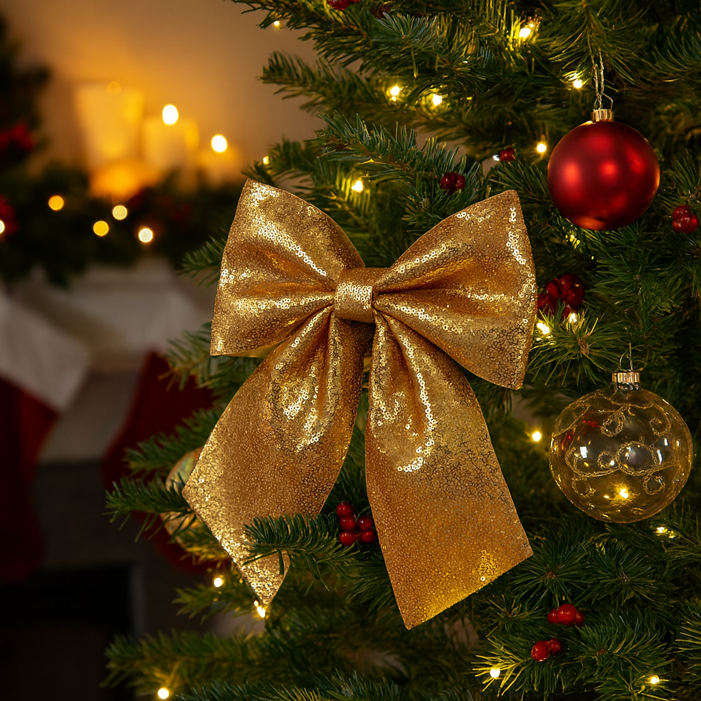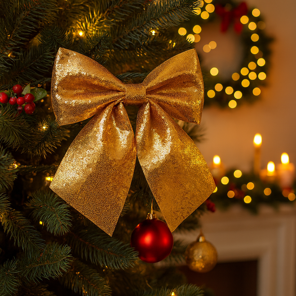 Aggiungi un tocco di luce e raffinatezza alle tue decorazioni natalizie con questo splendido fiocco dorato.