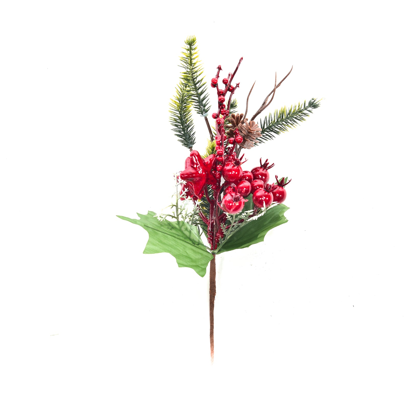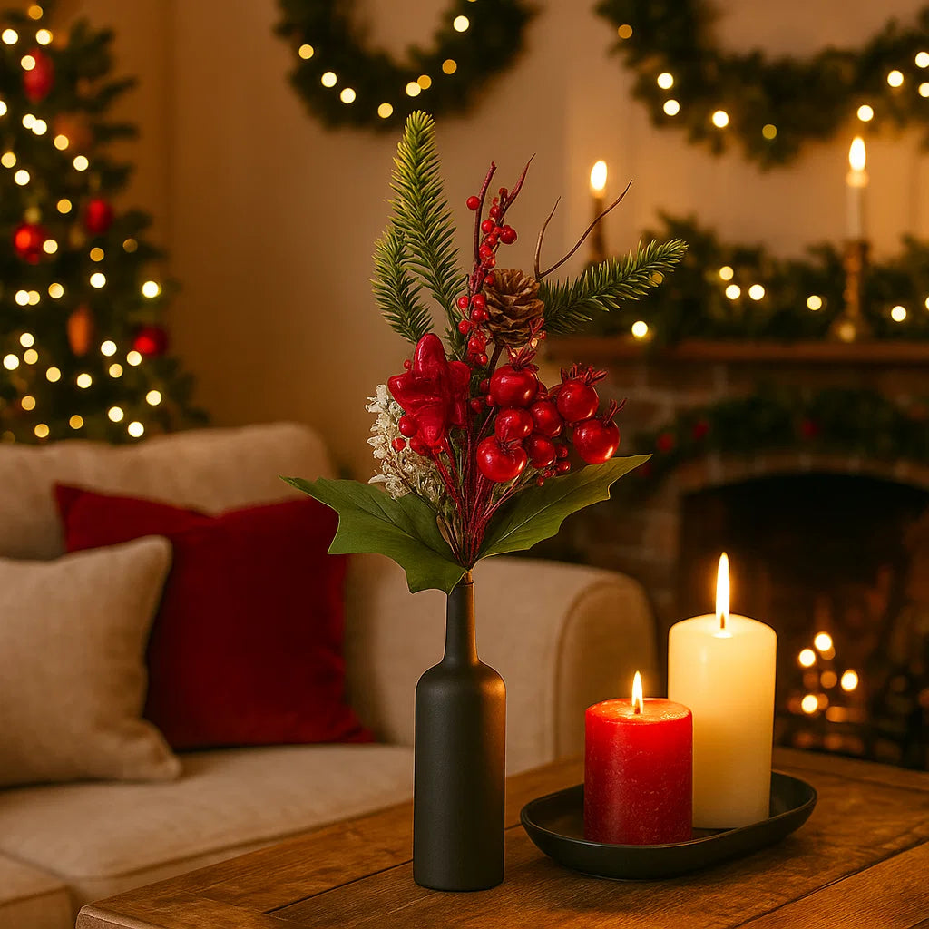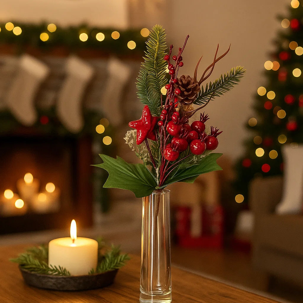 Il rametto natalizio decorativo con bacche bordeaux e pigne è un grazioso ornamento pensato per aggiungere un tocco di festività e calore a qualsiasi ambiente durante il periodo natalizio.