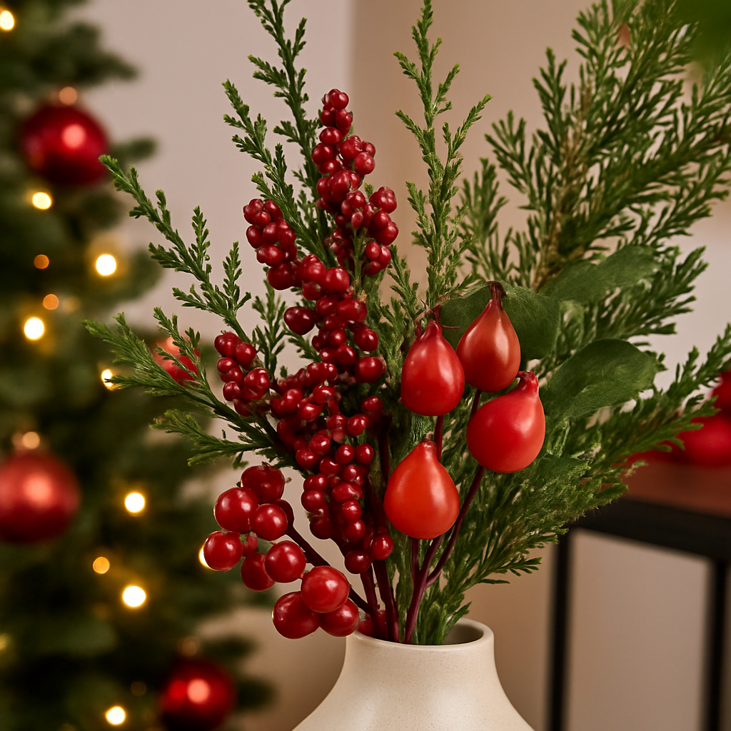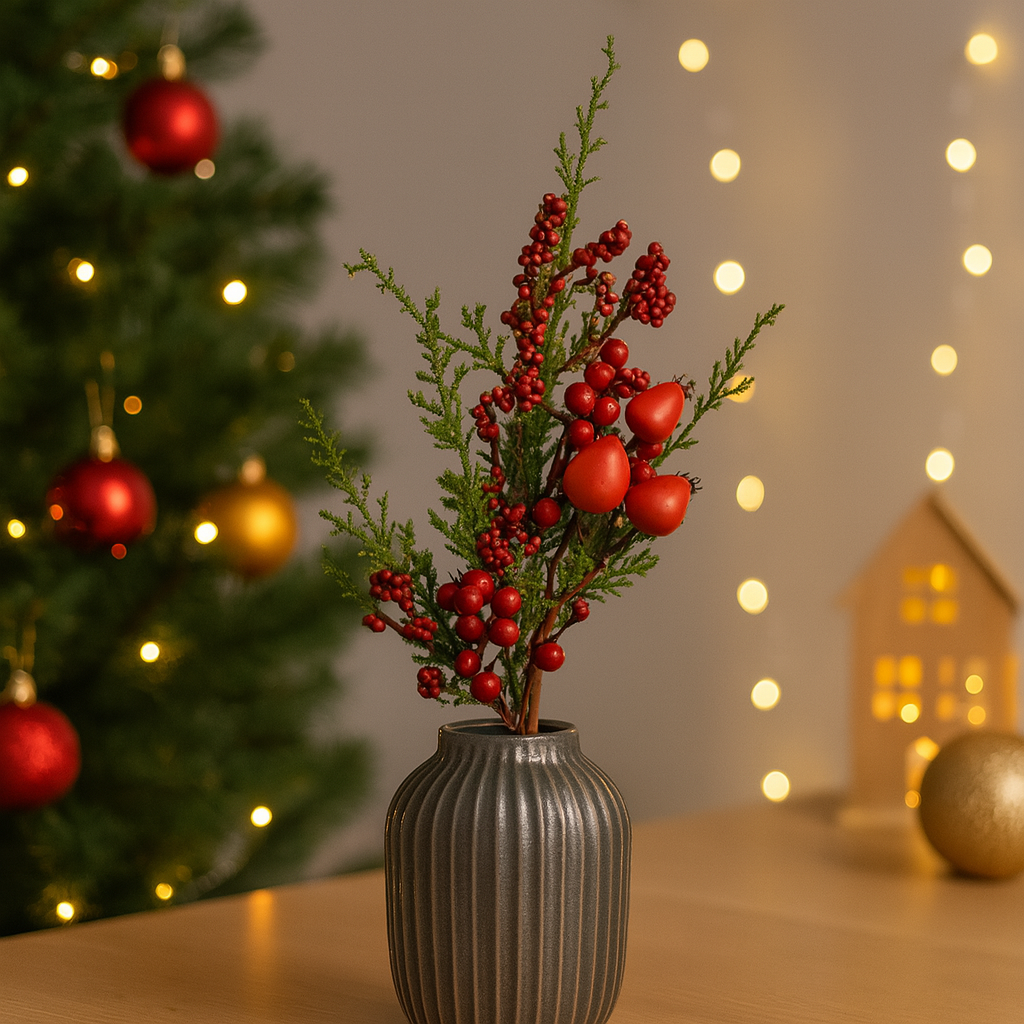Dona un tocco naturale e festoso ai tuoi addobbi con questo ramo decorativo da 25 cm, arricchito da bacche rosse dall’aspetto realistico. Perfetto per composizioni floreali, centrotavola, ghirlande o per arricchire l’albero di Natale con dettagli eleganti e tradizionali.