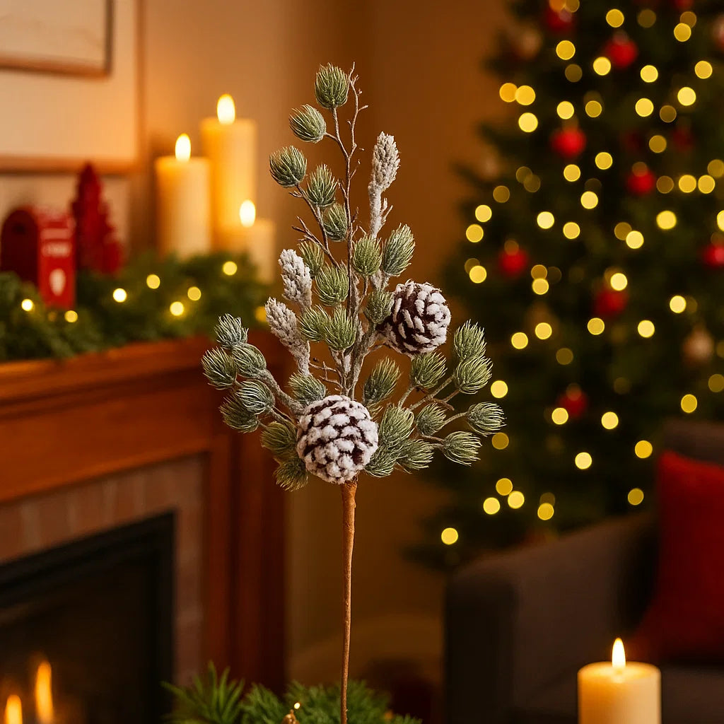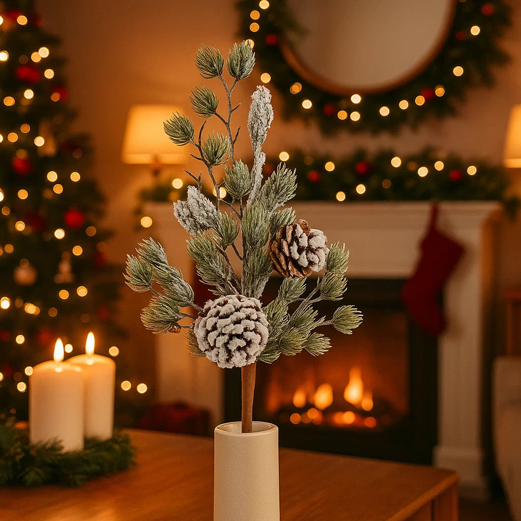 Questo ramo decorativo natalizio rappresenta un abete con pigna e effetto neve, ideale per aggiungere un tocco invernale e festoso ai tuoi addobbi.