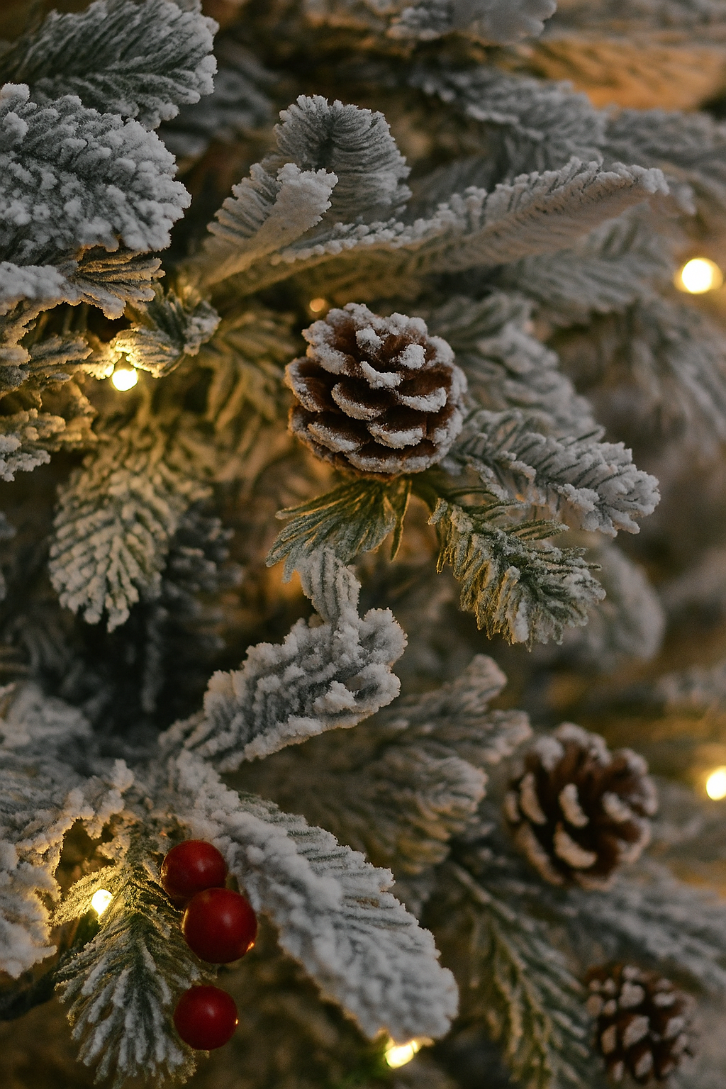 Albero di Natale innevato "Oslo" con pigne e bacche + big led in PE + PVC + Flock