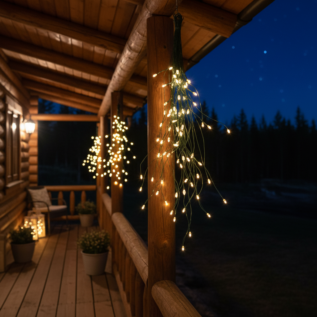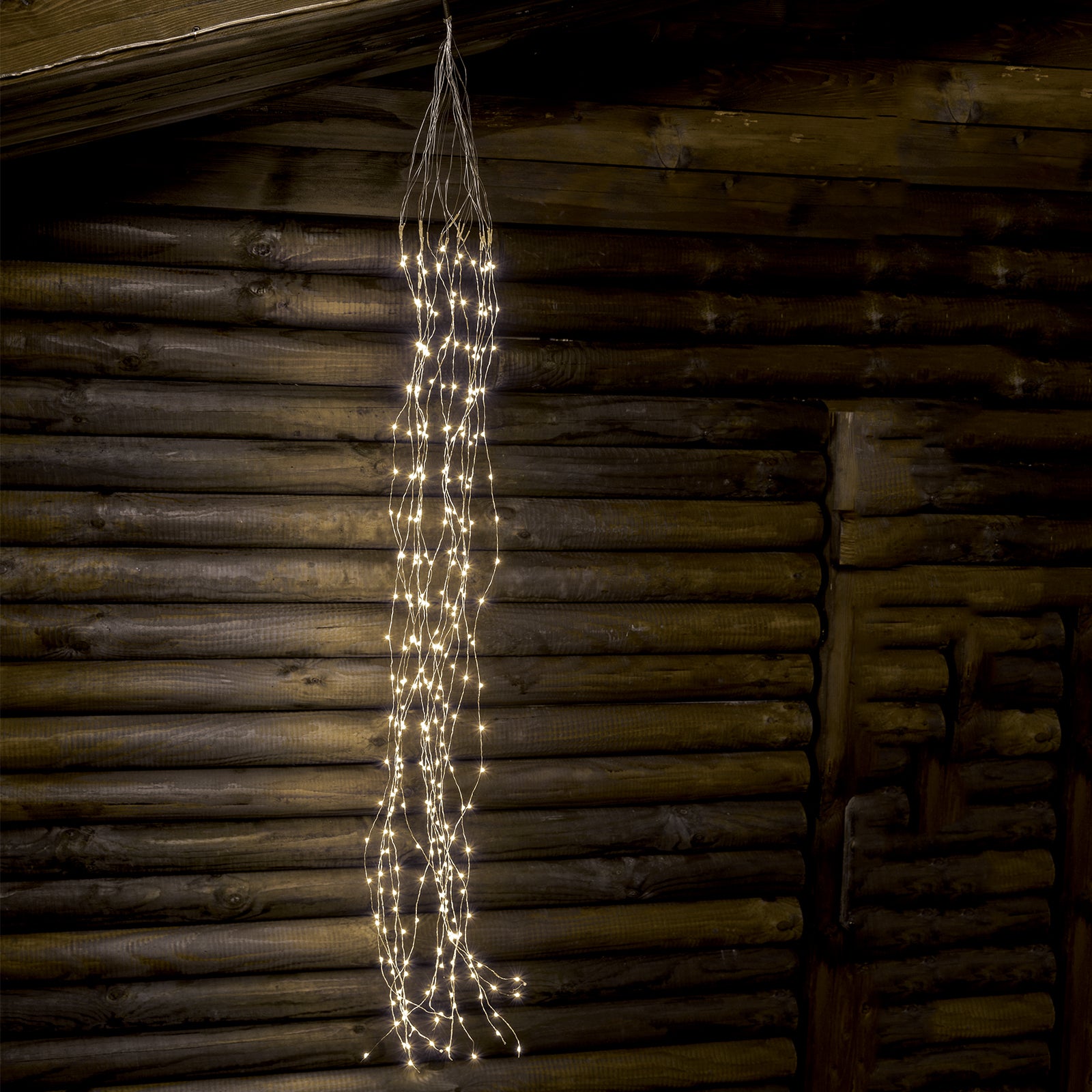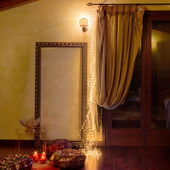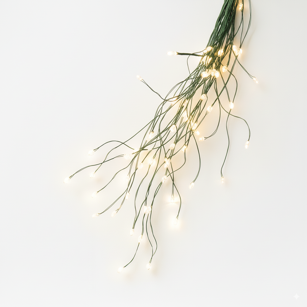 La cascata di luci è pensata per decorazioni interne di pareti, davanzali interni, scaffali. Ideale a Natale ma anche per allestire luoghi chiusi in modo scenografico in occasione di matrimoni o feste estive.