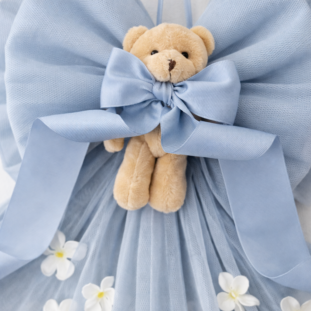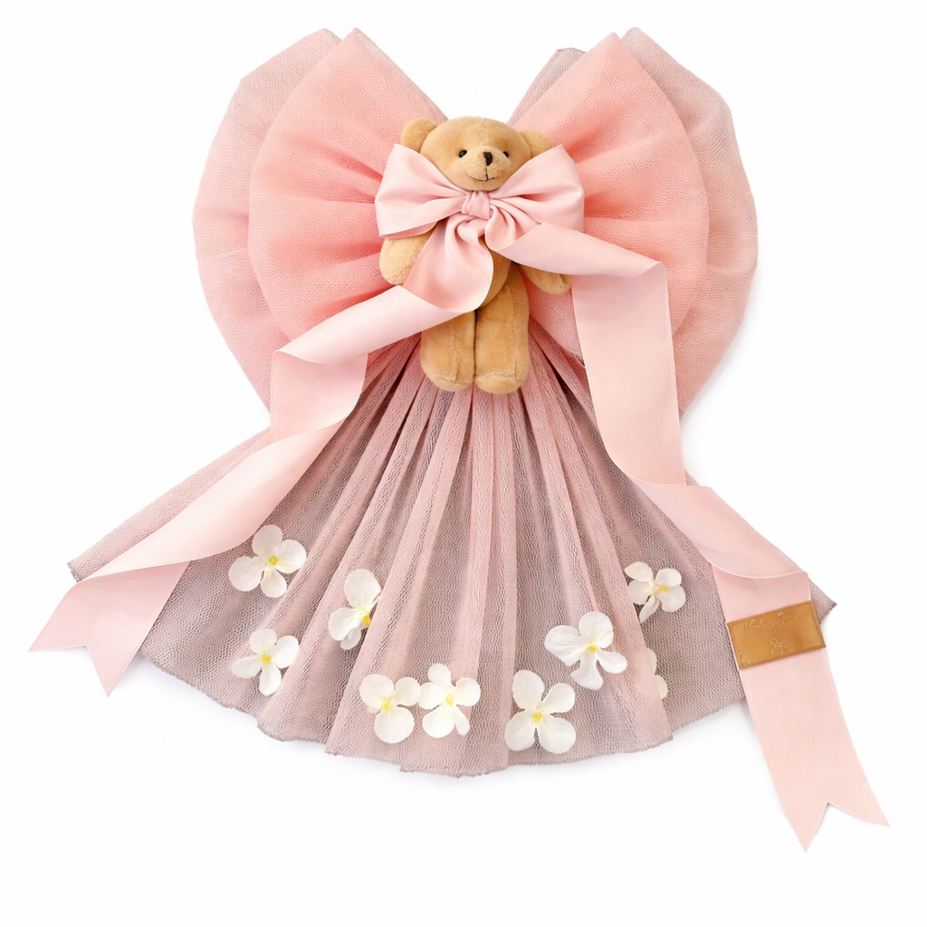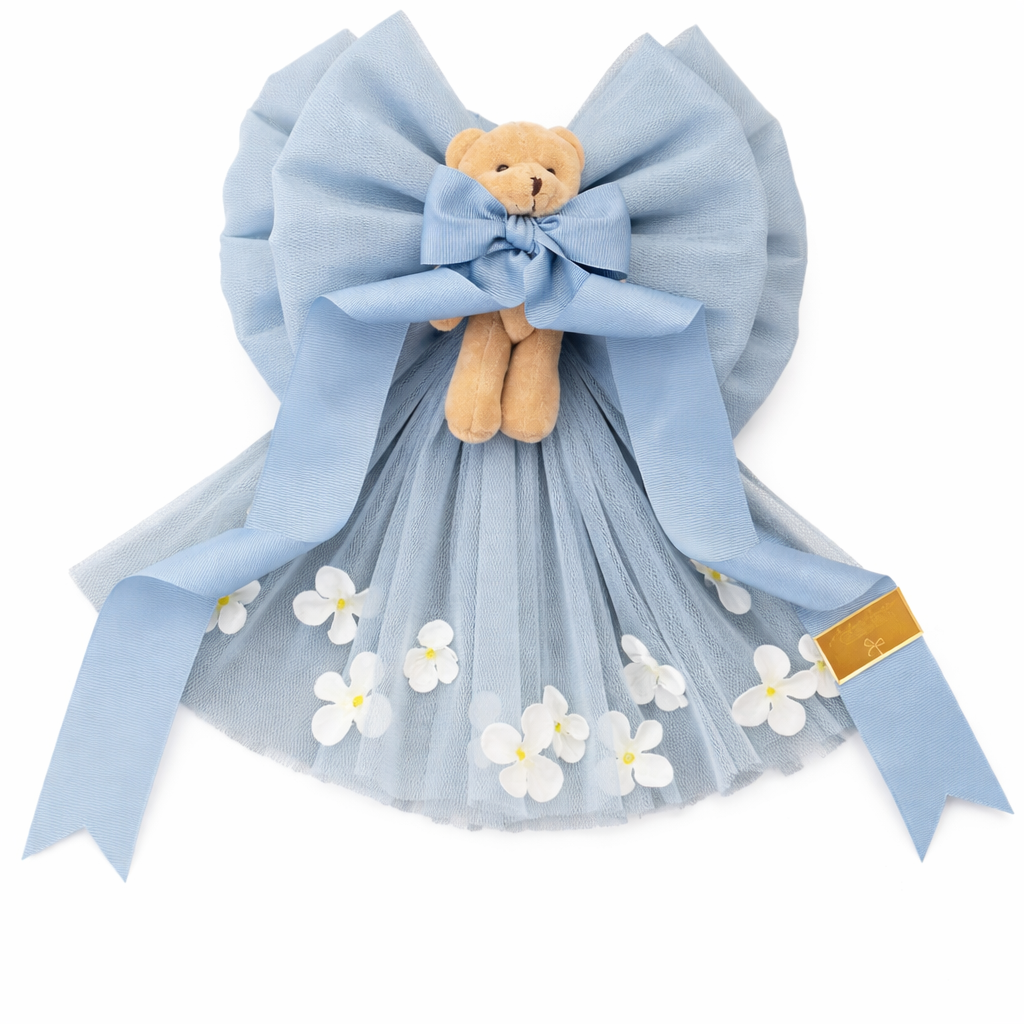 Questo raffinato fiocco nascita artigianale combina la delicatezza del tulle leggero, la dolcezza del tenero orsetto decorativo e la bellezza dei fiori ornamentali, creando una composizione romantica e armoniosa.