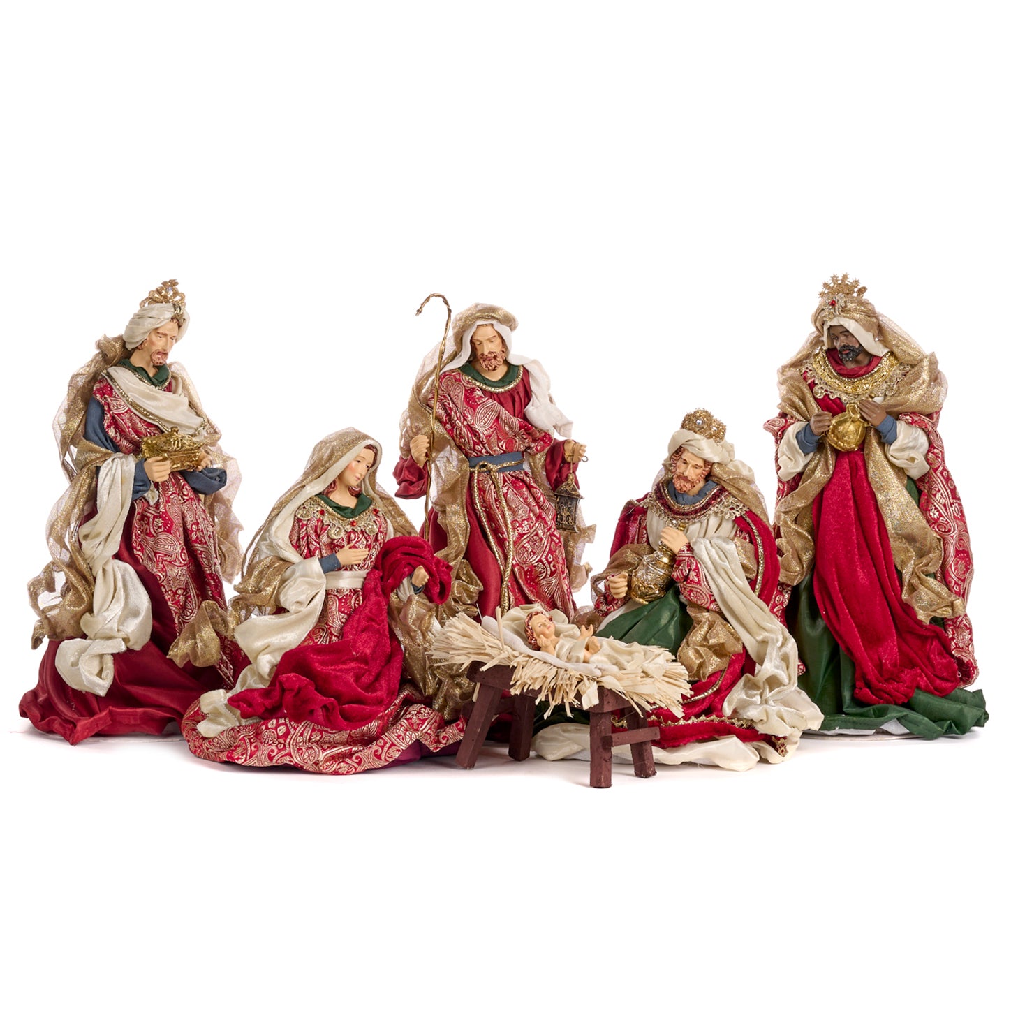 Il set comprende le figure principali della natività: la Vergine Maria, San Giuseppe, il Bambino Gesù nella mangiatoia, i Re Magi e un angelo.
