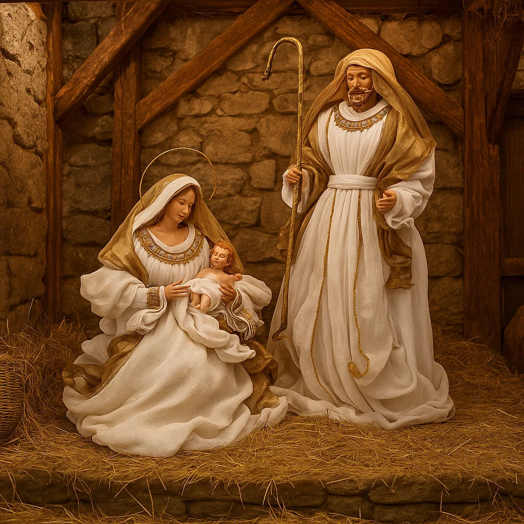 Natività in resina con 2 statue per presepe vestite in tessuto da 67 cm decorazione Oro e Beige