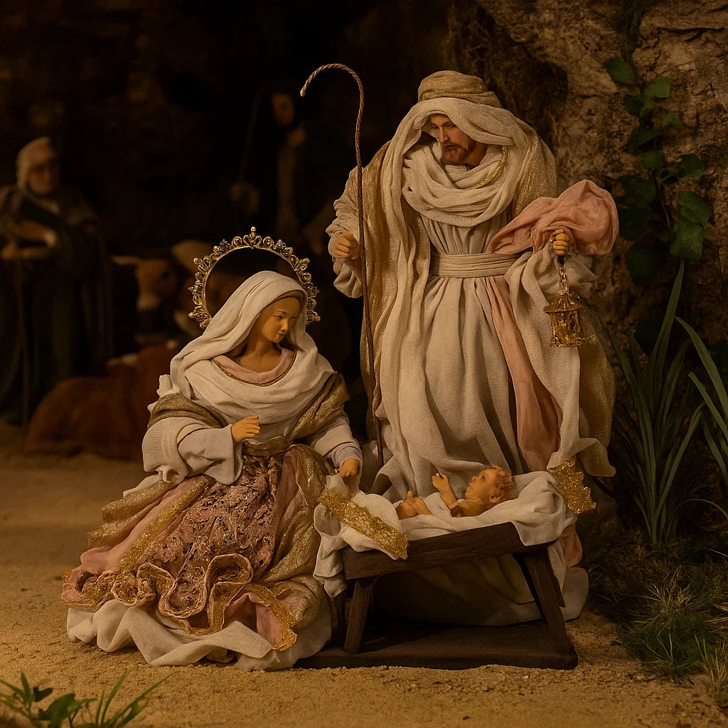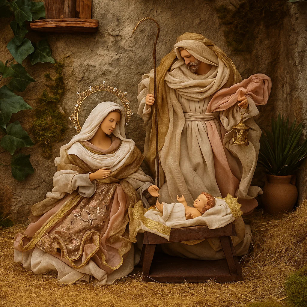 Raffigurazione della Sacra Famiglia, simbolo di pace e tradizione natalizia.