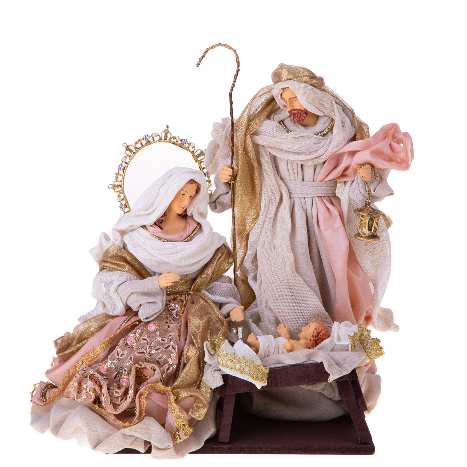 Dona un tocco di raffinatezza e spiritualità al tuo presepe con la Natività in tessuto rosa e oro da 36 cm.