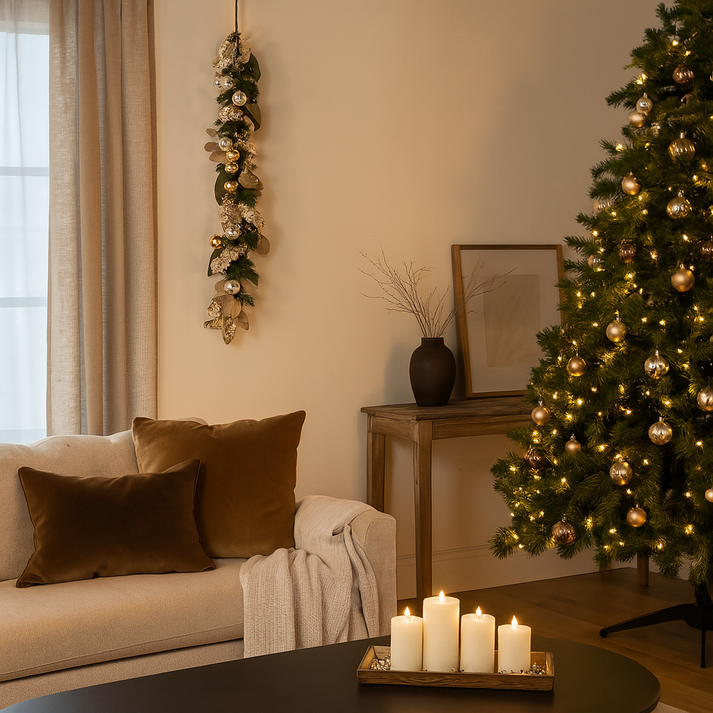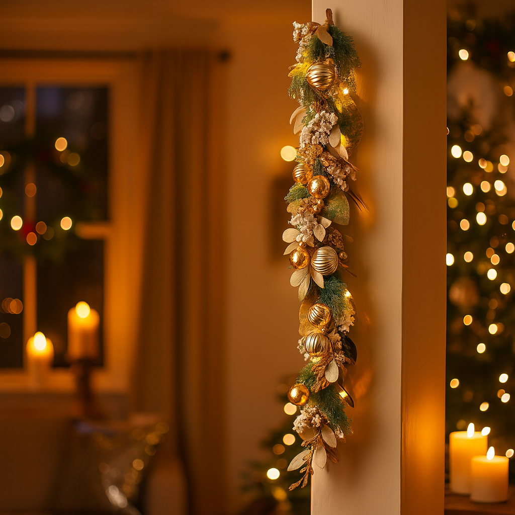 Grazie alla combinazione armoniosa di colori chiari e dettagli dorati, la ghirlanda diventa un complemento d’arredo che cattura lo sguardo e crea un’atmosfera calda e accogliente.