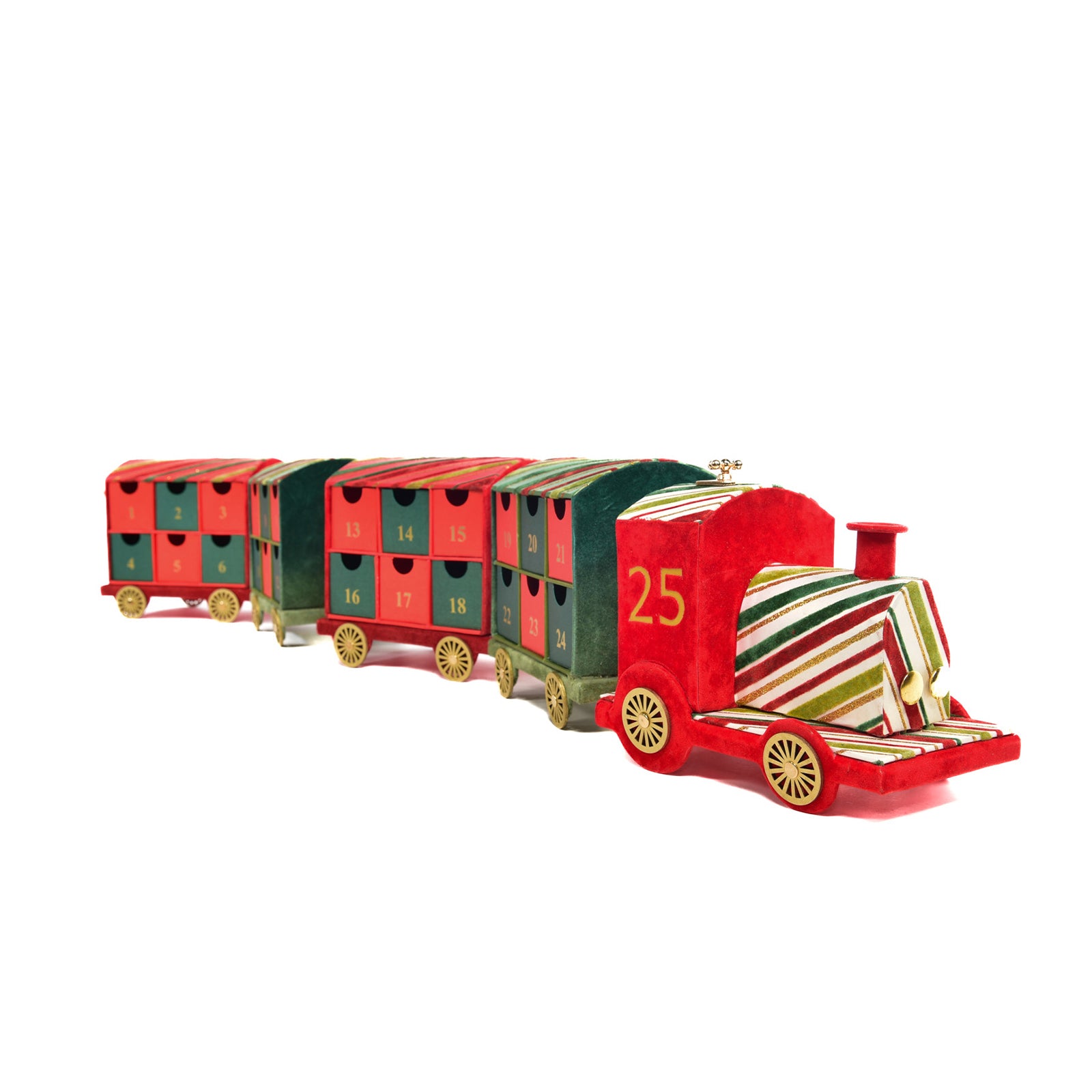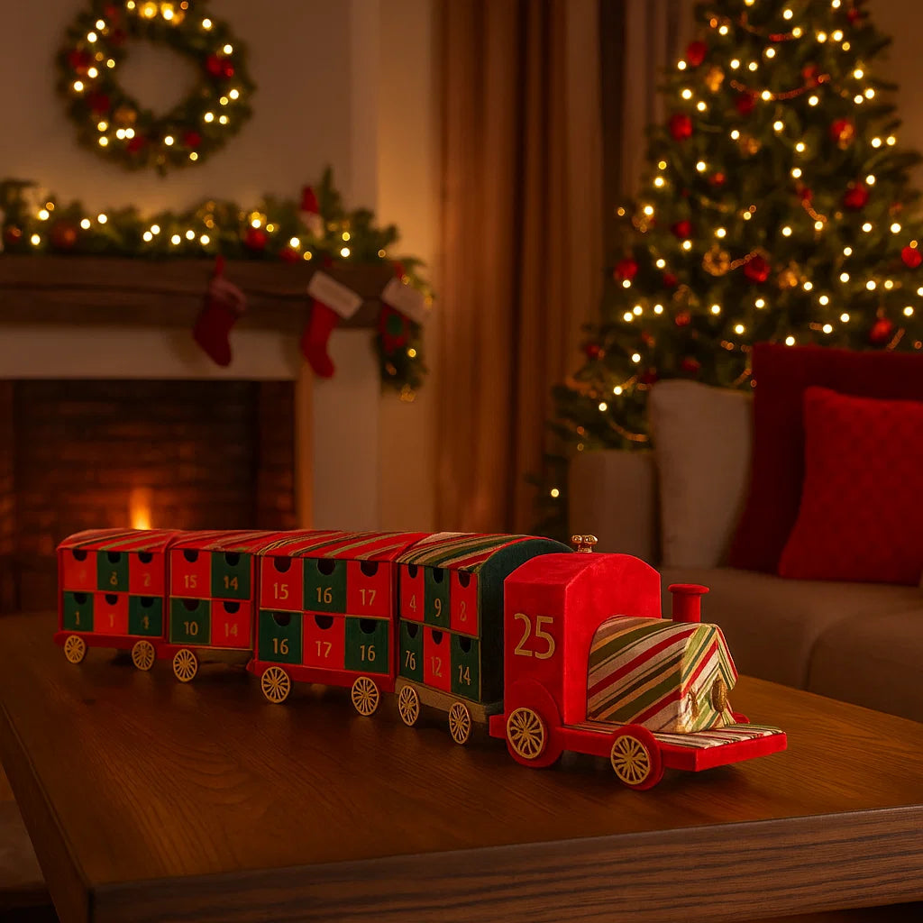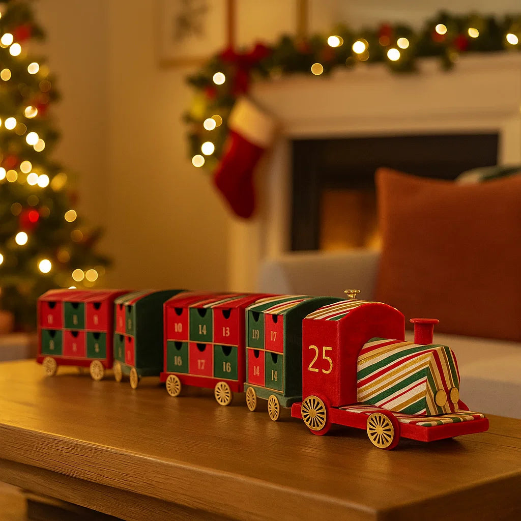Realizzato con carta resistente e decorato con dettagli festivi, il trenino è composto da una locomotiva e diversi vagoni, ognuno numerato per rappresentare i giorni dell'Avvento.