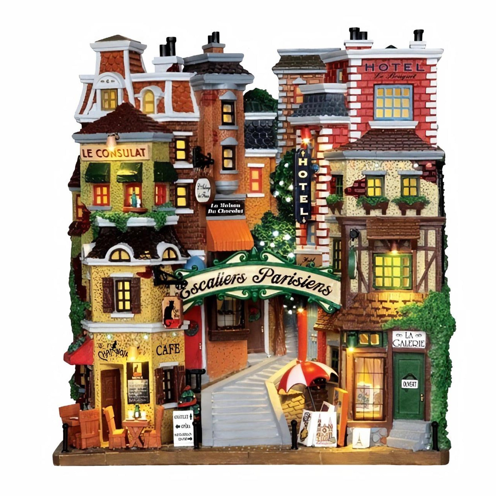 Quartiere natalizio "Scalinata Parigina" con luci decorazione per villaggio di Natale in resina
