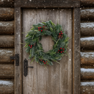 Le bacche rosse e le pigne naturali incastonate tra i rami completano la composizione con dettagli caldi e autentici, aggiungendo contrasto cromatico e realismo alla ghirlanda.