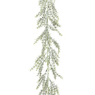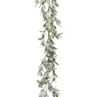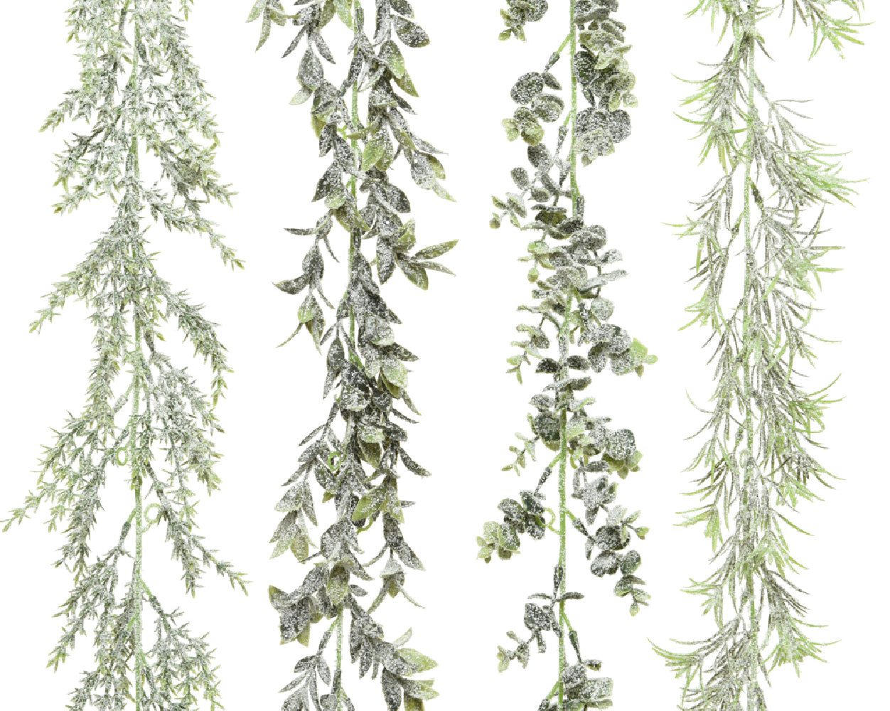 Le foglie sono decorate con uno strato di neve artificiale che crea l’illusione di un paesaggio invernale innevato, conferendo alla ghirlanda un aspetto realistico e raffinato. La combinazione tra il verde delle foglie e il bianco della neve richiama l’essenza delle feste, evocando un senso di pace e tradizione.