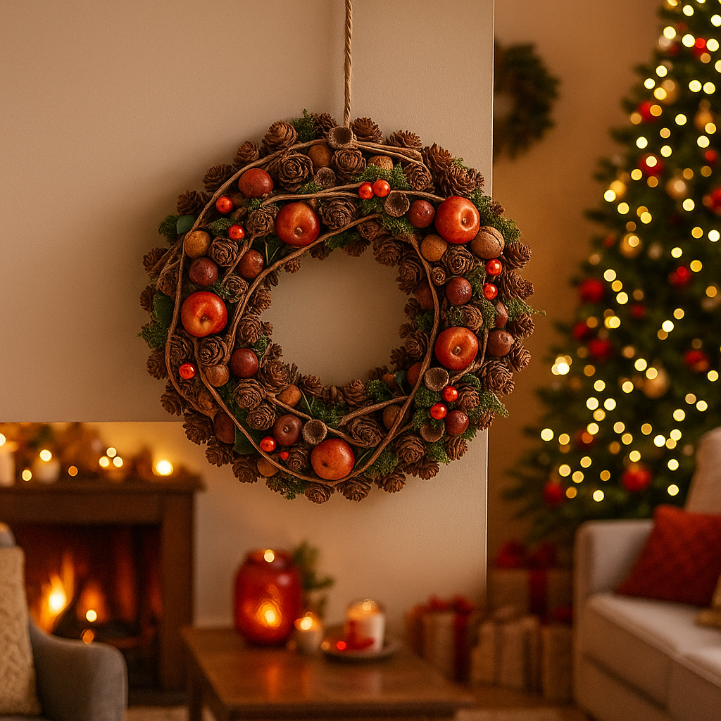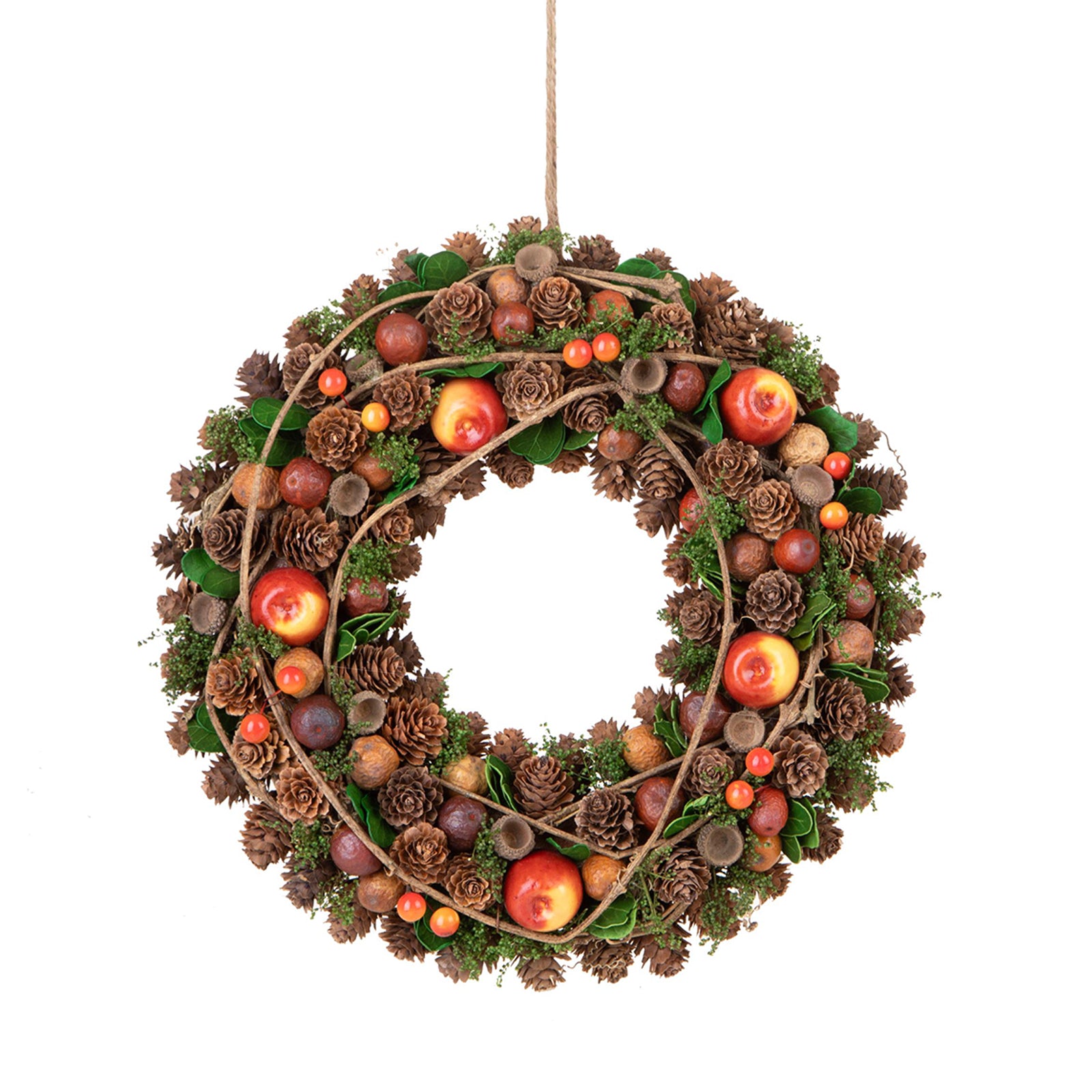 Ghirlanda corona con frutti e pigne, decorazione natalizia da 33 cm
