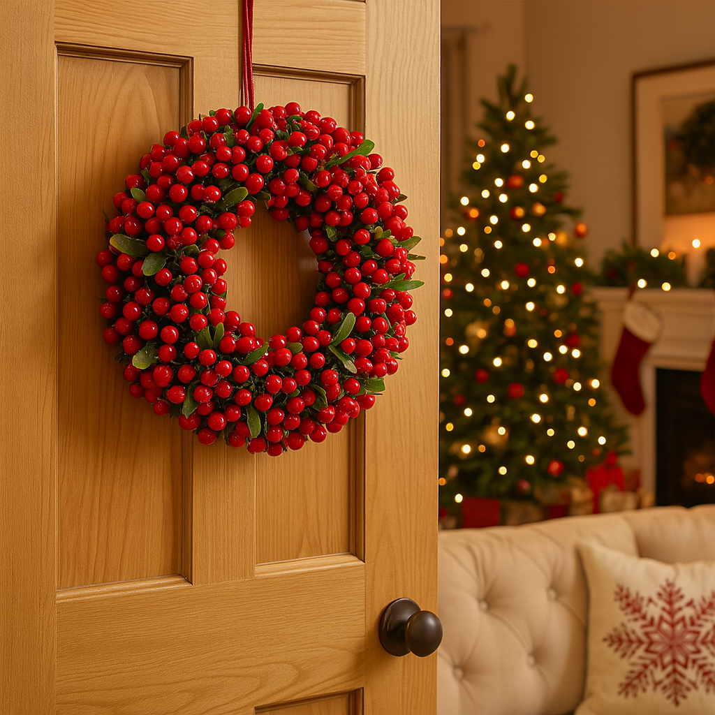 Ghirlanda tonda natalizia con bacche rosse dietro porta 45 cm