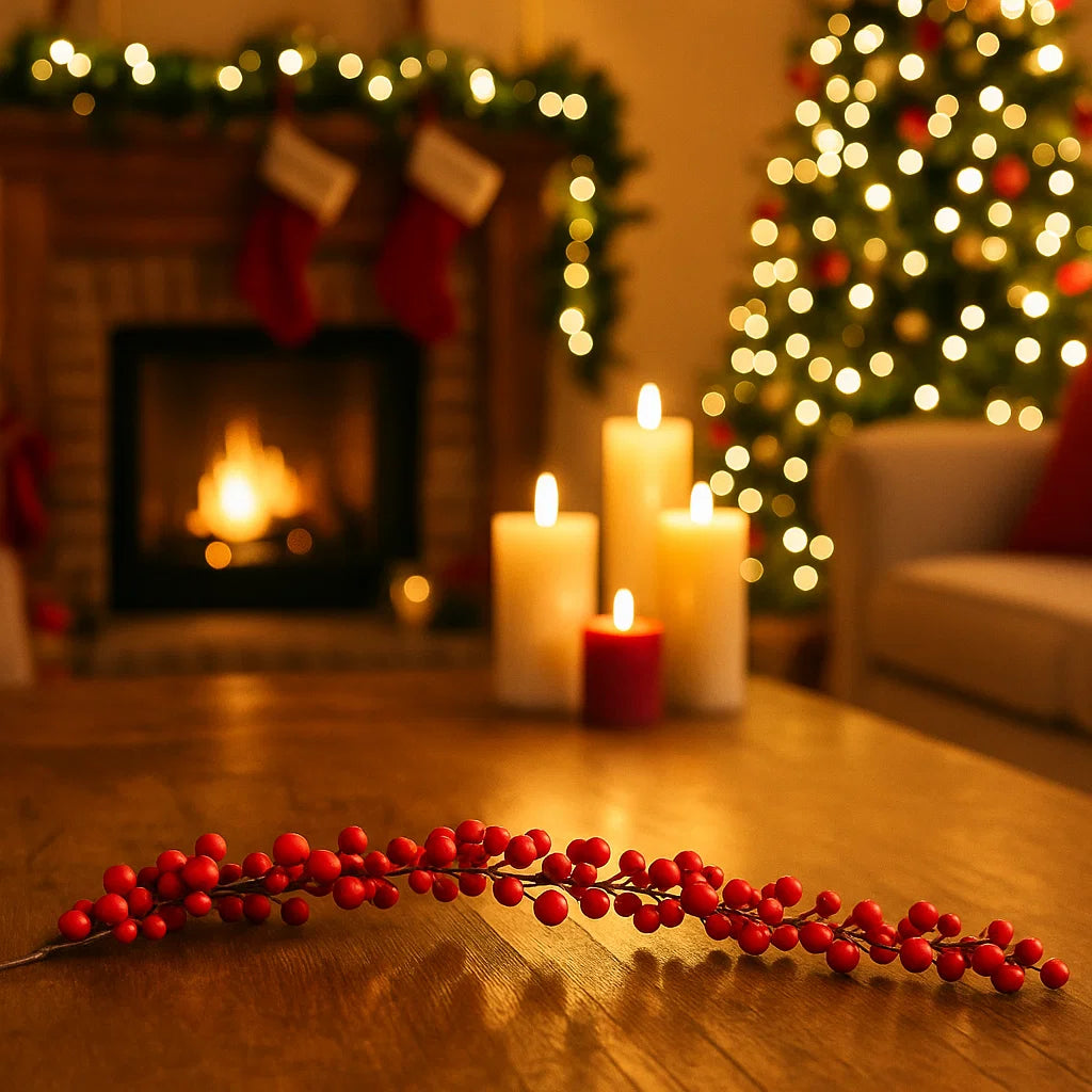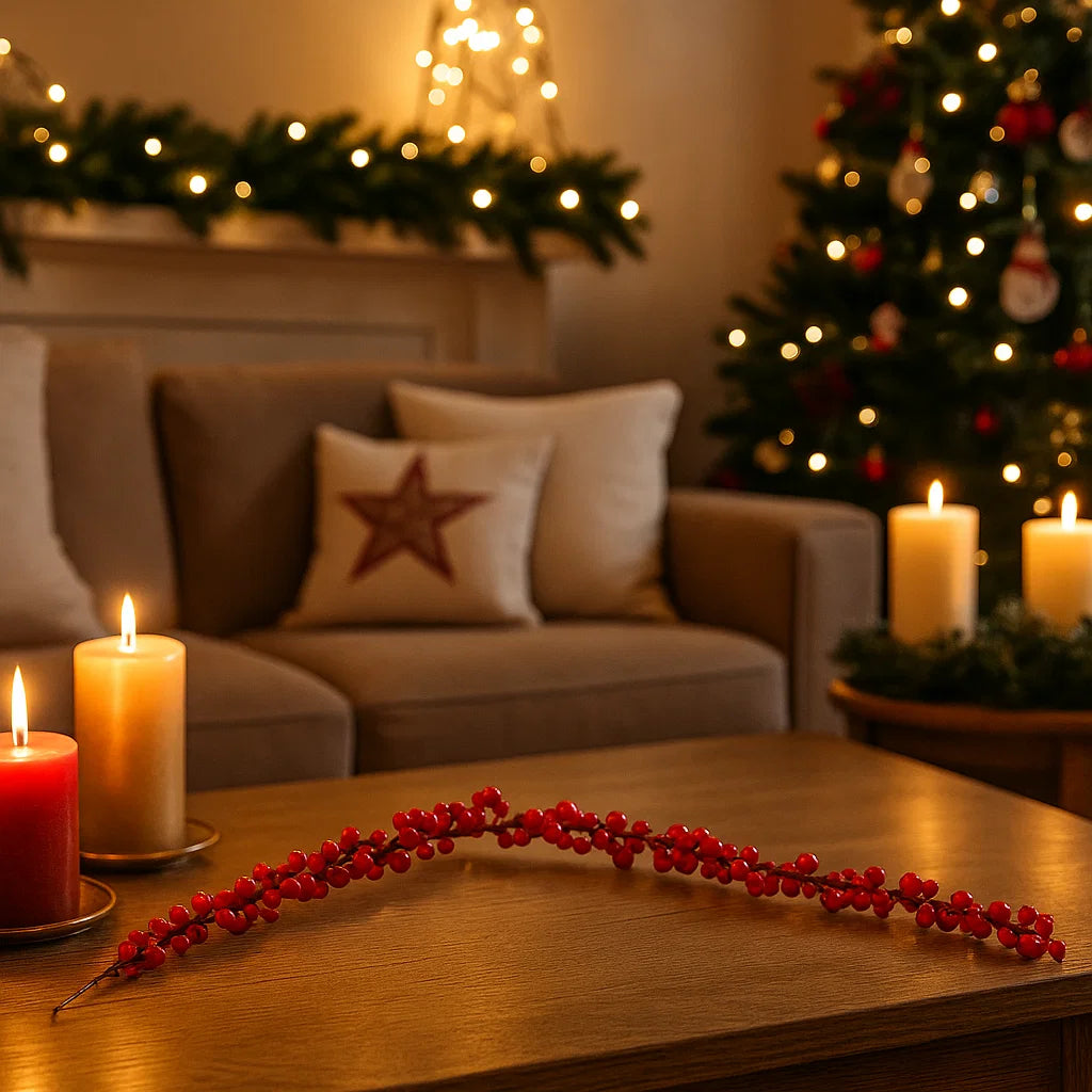 Questa struttura è rivestita da una vegetazione artificiale che imita i rami di pino o abete, trattati con un effetto floccato per evocare la fresca neve invernale. Il trattamento floccato non solo aggiunge realismo alla ghirlanda, ma crea anche un contrasto visivo piacevole con le bacche rosse.
