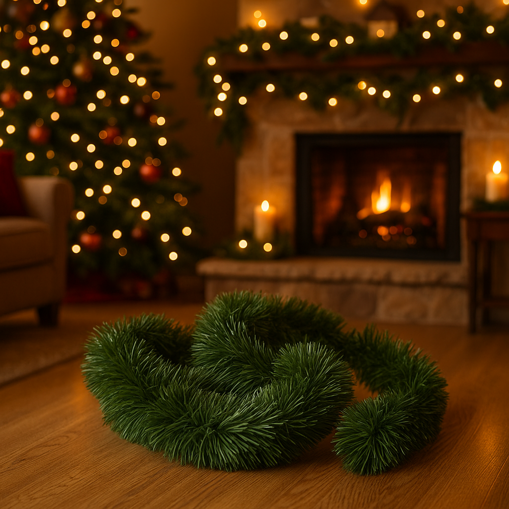 La ghirlanda natalizia descritta è realizzata in PVC verde e viene utilizzata come decorazione per interni durante la stagione natalizia. Il PVC è un materiale leggero, resistente e facile da modellare, che consente di creare una ghirlanda dall'aspetto realistico.