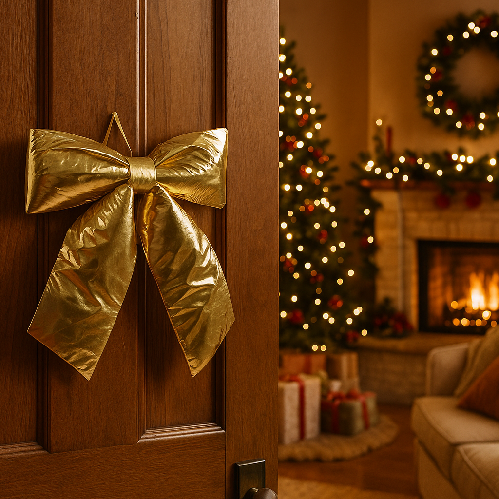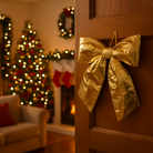 Fiocco Oro Metallizzato in tessuto decorazione natalizia per albero e ghirlanda dietro porta