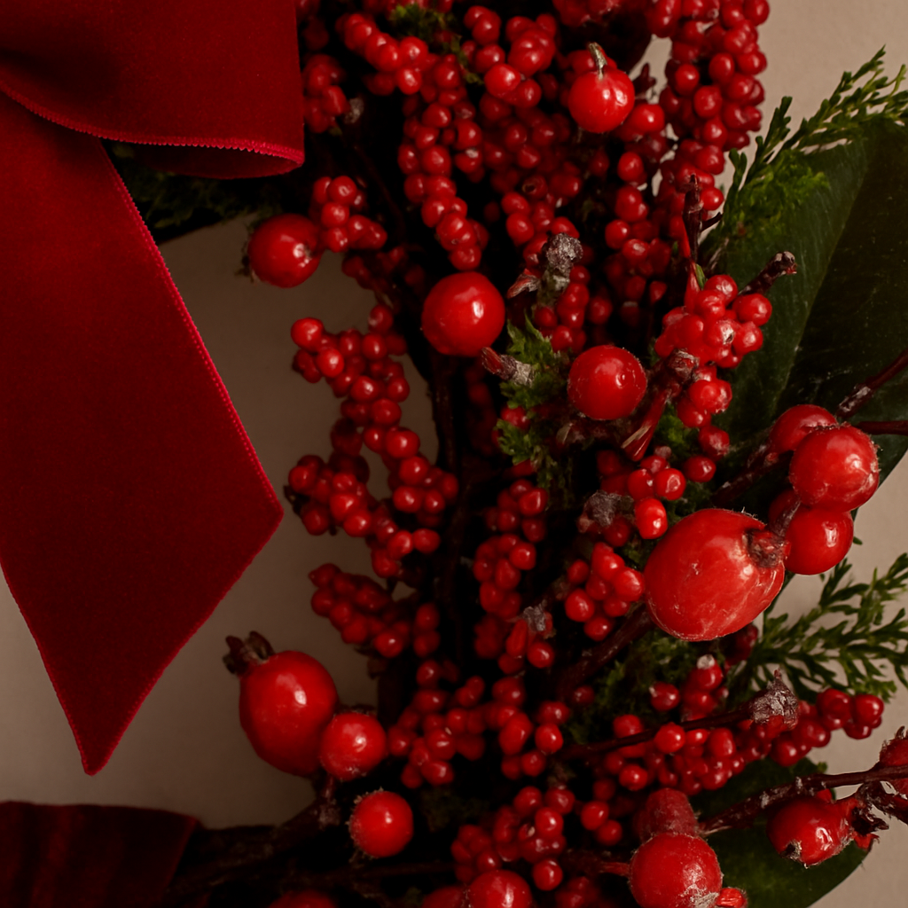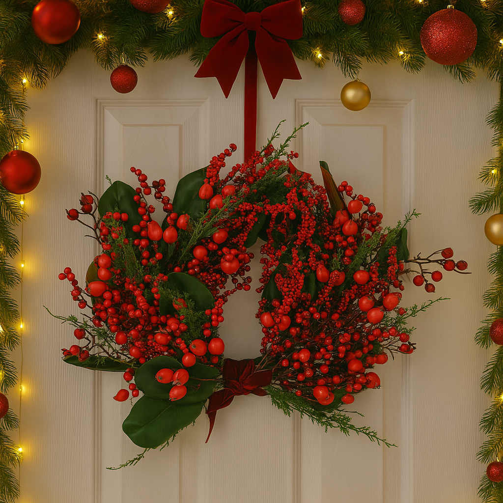 Ideale per uso interno ed esterno (in zone riparate), si integra facilmente con altre decorazioni per creare un ingresso elegante e invitante. Il contrasto tra il verde dei rami e il rosso delle bacche rende questa ghirlanda un dettaglio semplice ma di grande effetto.
