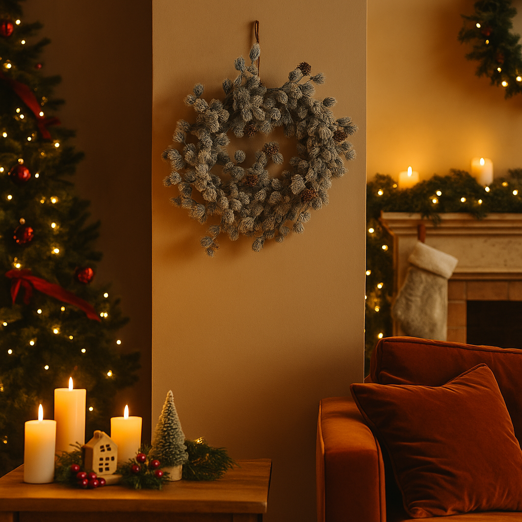 Perfettamente equilibrata e rifinita con pigne naturali, questa decorazione dal diametro di 45 cm trasforma ogni ingresso in un invito caloroso per le festività.