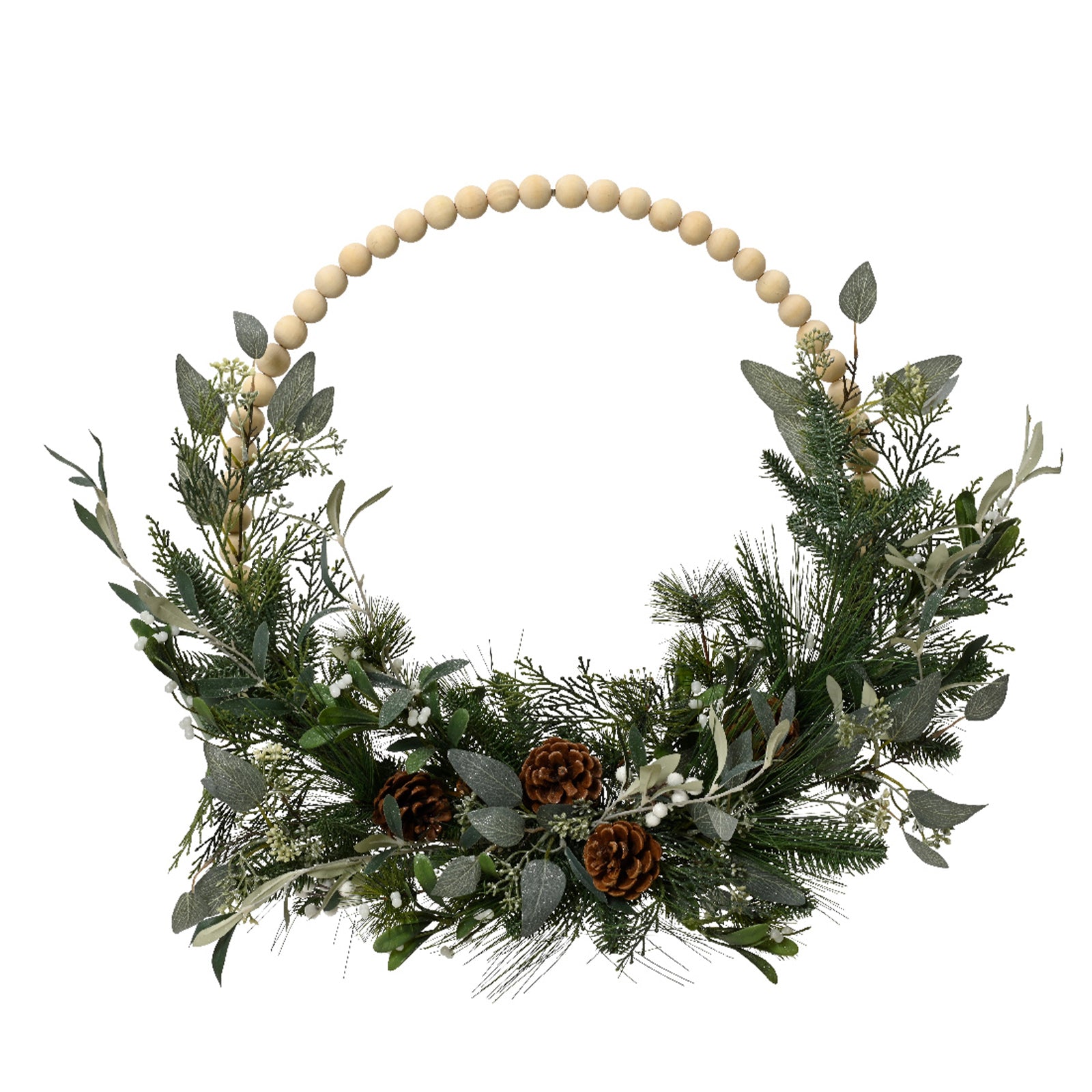 Ghirlanda tonda natalizia con pigne e bacche bianche dietro porta 60 cm