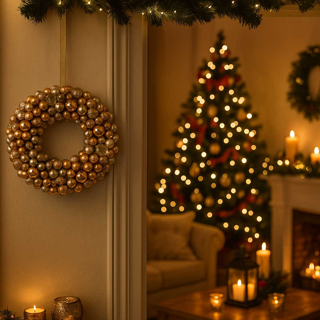Ghirlanda Tonda Natalizia con Sfere Oro – Decorazione per Dietroporta da 25 cm