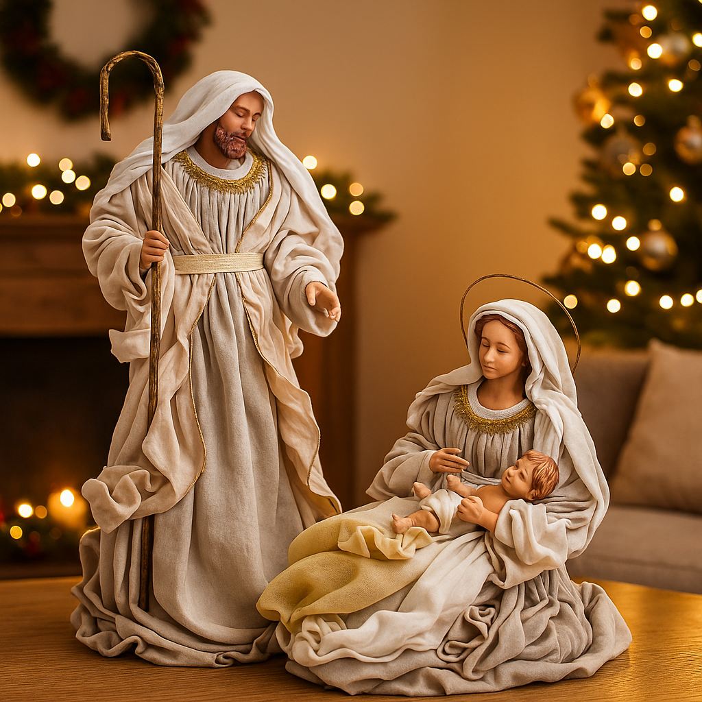 Natività completa statue per presepe con vestiti in tessuto Crema h 67 cm