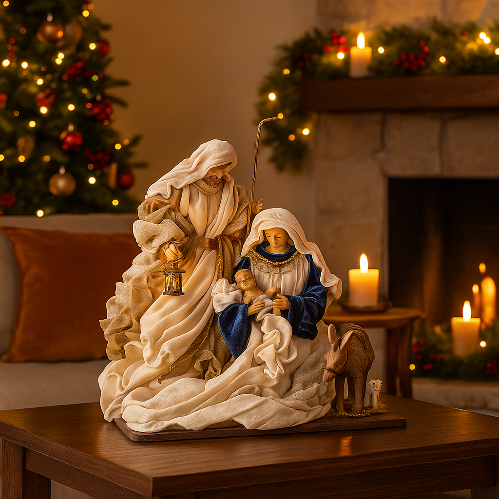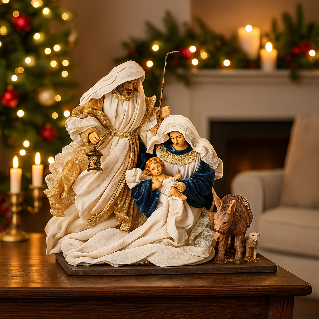 Natività con Asino con vestiti in tessuto color Blu Oro statue per presepe